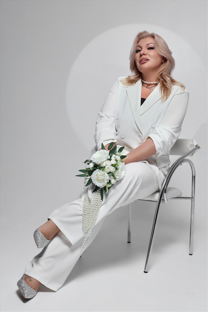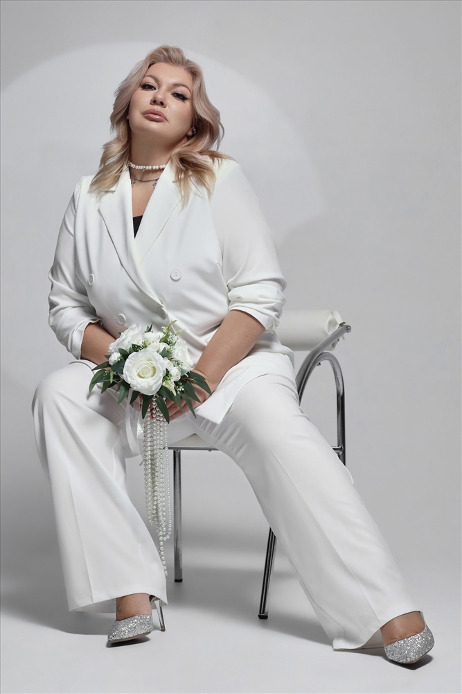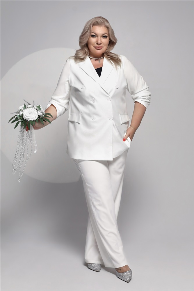 Стильный брючный костюм из мягкой ткани - состоит из жакета и брюк.