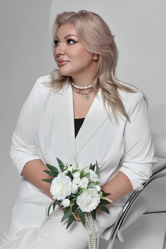 Жакет прямого кроя с V-образным вырезом, который оформлен классическим отложным воротником с лацканами. Передние полочки дополнены атласной подкладкой, по спинке подкладка отсутствует. Рукава полной длины украшены декоративными пуговками. Аккуратные подплечники зрительно вытягивают силуэт и делают бедра визуально у́же. Вытачки на груди и по спинке способствуют оптимальной посадке по фигуре. Модель на двубортной застёжке, что добавляет модели практичности и оригинальности. По бокам декоративные клапаны. При желании талию можно подчеркнуть съемным поясом в тон, который идёт в комплекте.