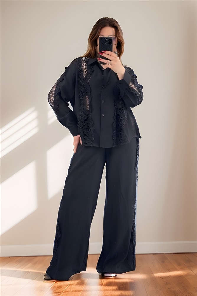Рубашка прямого кроя. Круглый вырез оформлен классическим отложным воротником. Рукава полной длины с приспущенной проймой по низу дополнены манжетами на пуговках. Модель застёгивается на оригинальные пуговки под планку. Вытачки на груди и закругленные бока способствуют оптимальной посадке по фигуре. Кружевные вставки на рубашке и брюках добавляют нарядности и женственности. Костюм превосходно сочетается как с каблуками для создания нарядного образа, так и с кедами для более повседневного стиля. Модель также можно носить по отдельности.
