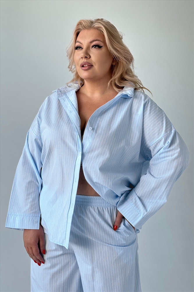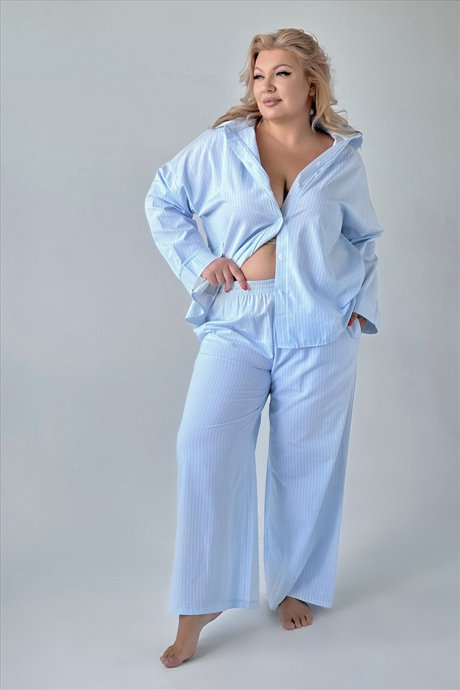 Стильный и комфортный костюм состоит из удлиненной рубашки и брюк выполненных из мягкого материала. Рубашка имеет классический отложной воротник и рукава полной длины с приспущенной проймой. Кокетка по спинке обеспечивает оптимальную посадку по фигуре. Модель застегивается на оригинальные пуговки по всей длине под планку.