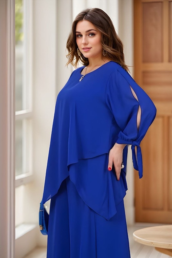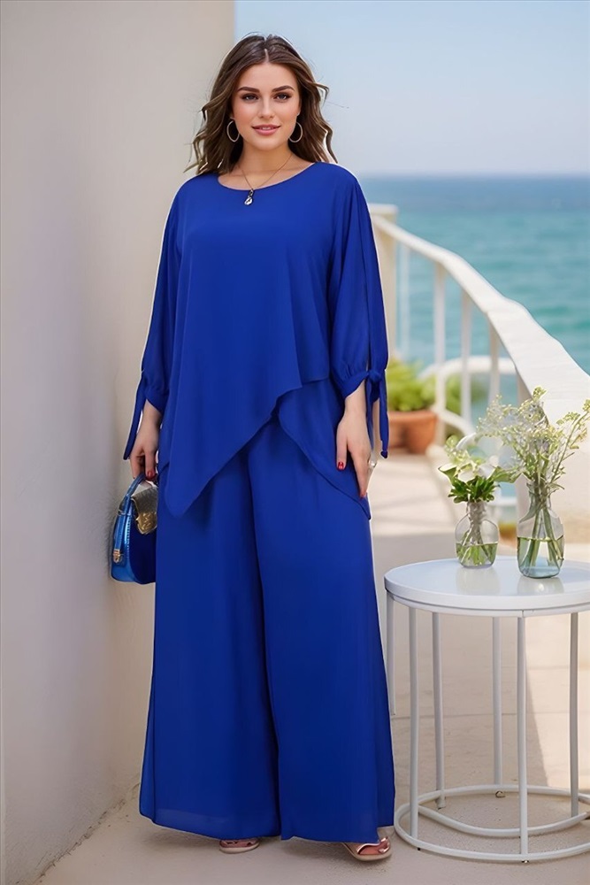 Стильный комплект из туники и брюк выполнен из мягкой струящейся ткани. Имеет круглый вырез и свободные рукава длиной 7/8, которые сверху декорированы разрезами и оригинальной завязкой по низу. Область талии оформлен оригинальным запАхом, что позволяет скрыть возможные несовершенства фигуры. Асимметричный нижний край туники зрительно вытягивает силуэт.