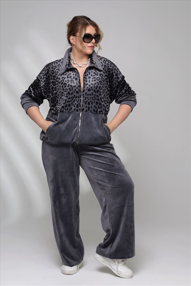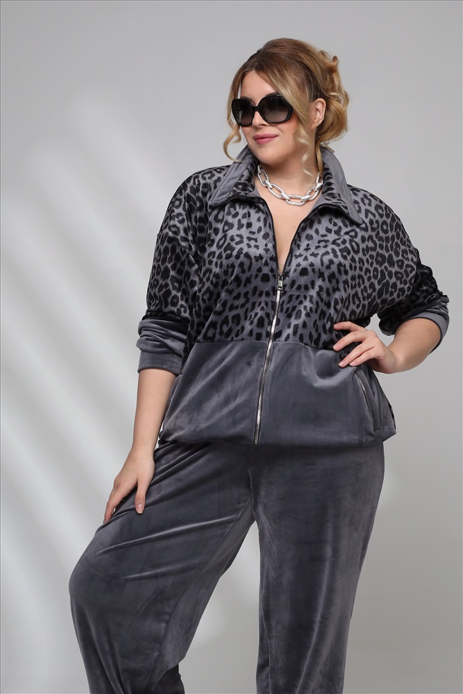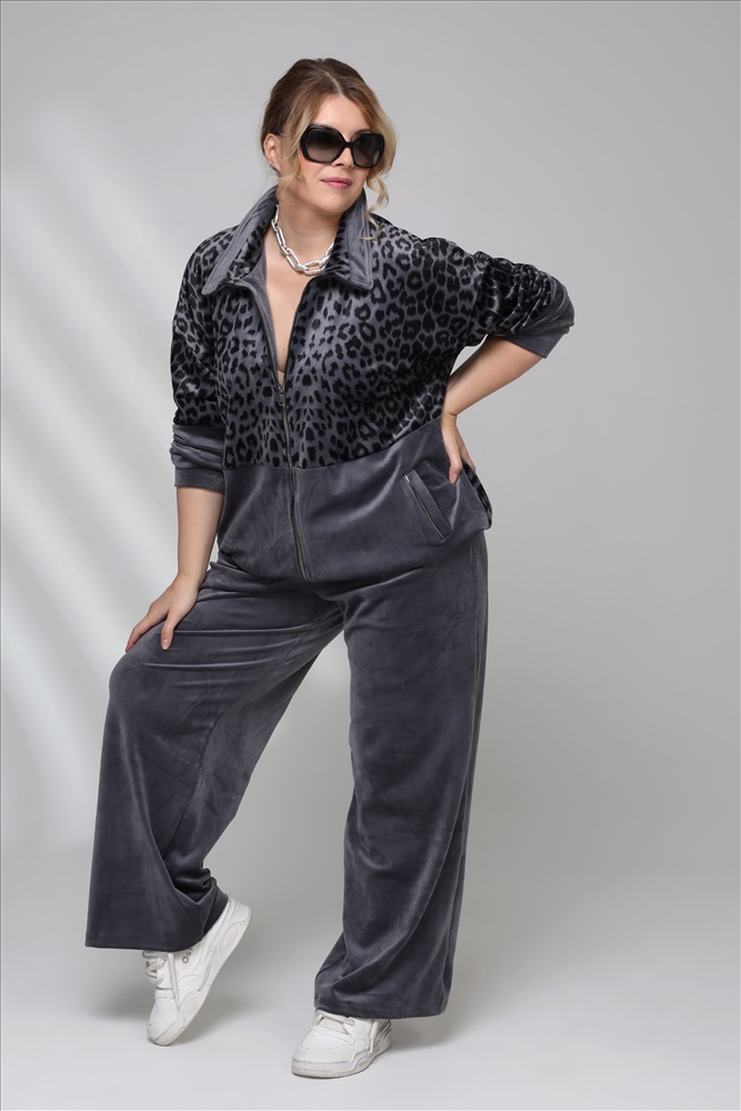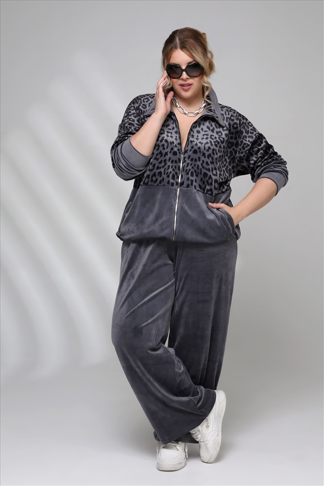 Цвет: Серый Фасон: Костюм, Костюм спортивный Материал: Велюр Длина рукава: Длинный рукав Параметры модели: Рост 173 см, Размер 54 Костюм велюровый с леопардовой вставкой серый
