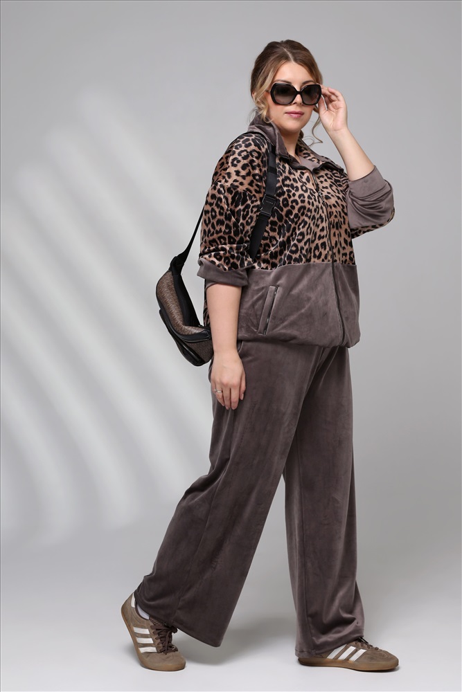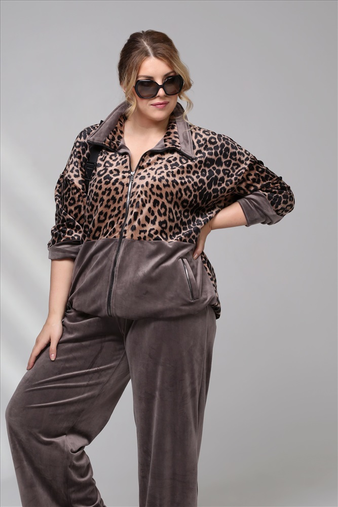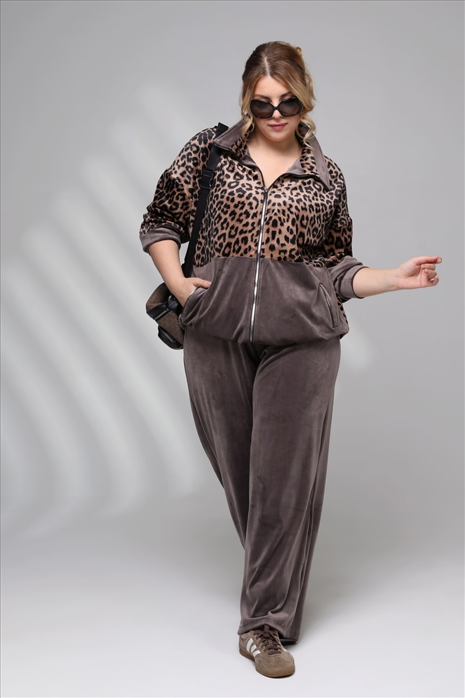 Цвет: Бежевый Фасон: Костюм, Костюм спортивный Материал: Велюр Длина рукава: Длинный рукав Параметры модели: Рост 173 см, Размер 54 Костюм велюровый с леопардовой вставкой бежевый