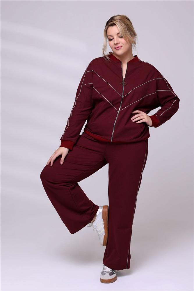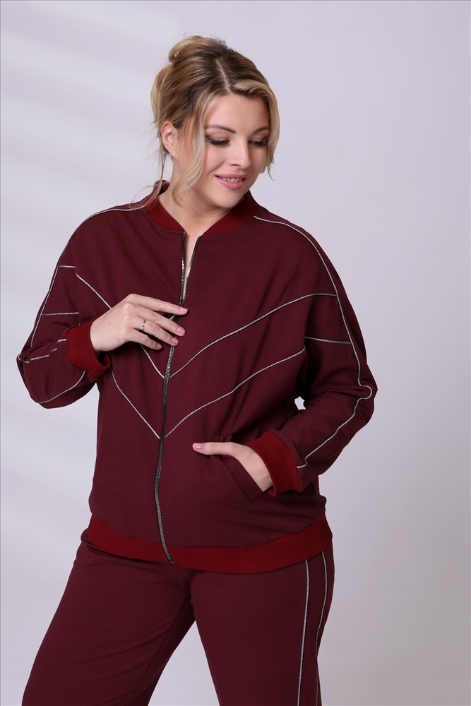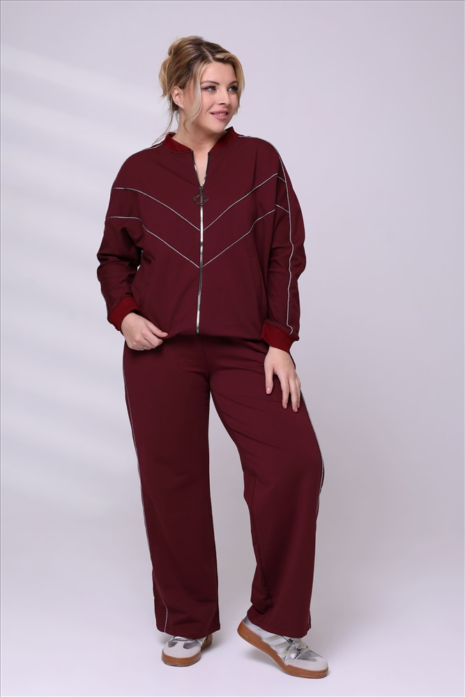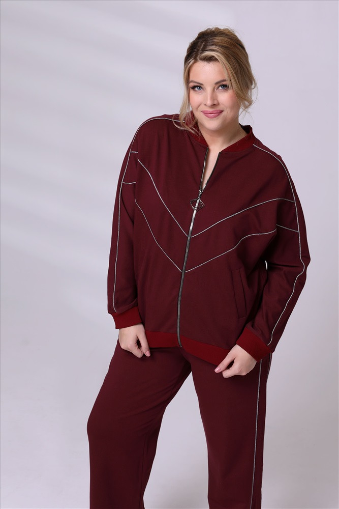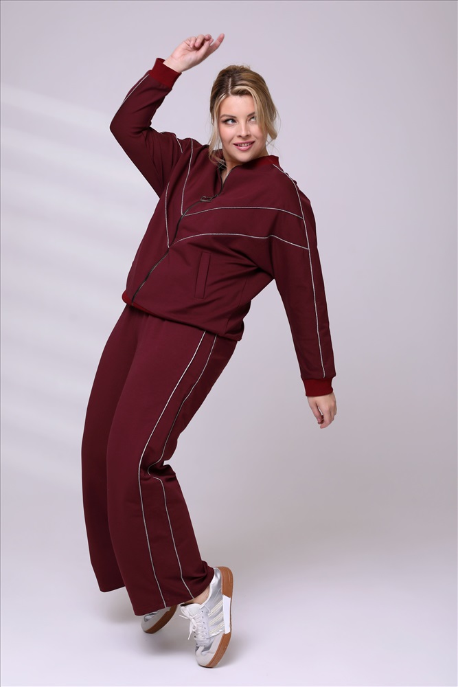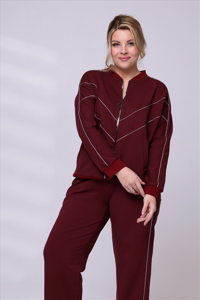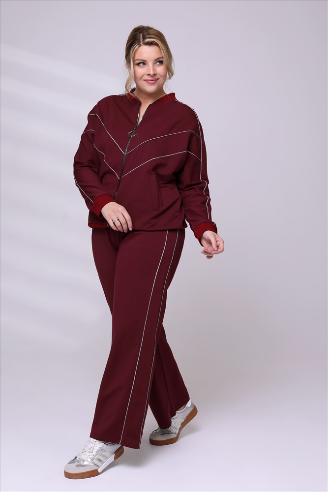 Стильная кофта присобрана по низу на притачную резинку. Круглый вырез дополнен стойкой-воротником, который защитит шею от ветра. Рукава-реглан полной длины по низу оформлены широкими манжетами. Кофта застёгивается спереди по всей длине на молнию. Контрастные строчки на кофте и брюках освежают образ и добавляют динамичности. Прорезные карманы оформлены листочками. Стильный костюм отлично подходит для тренировок и прогулок в прохладную ветреную погоду.