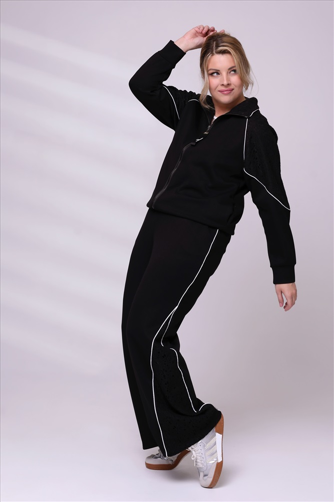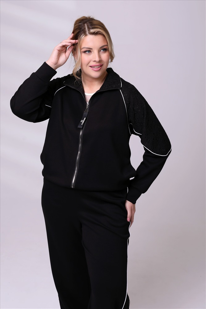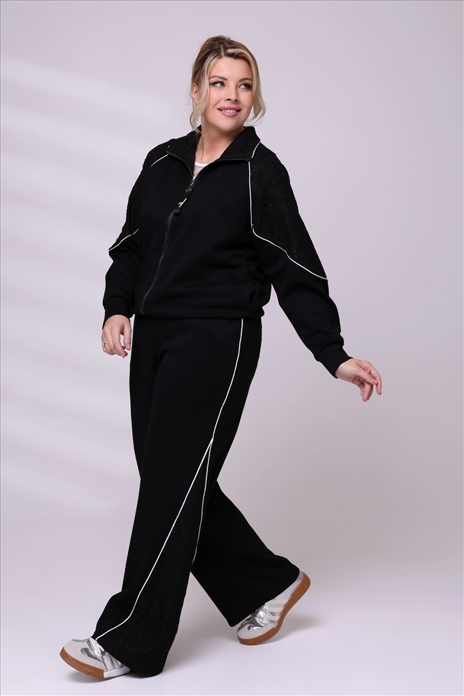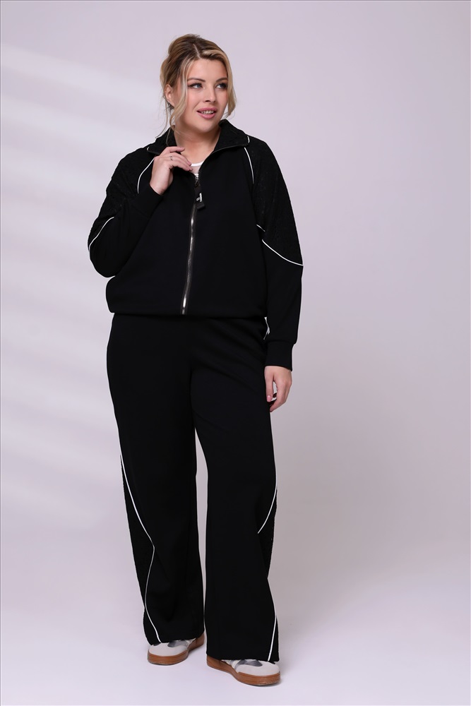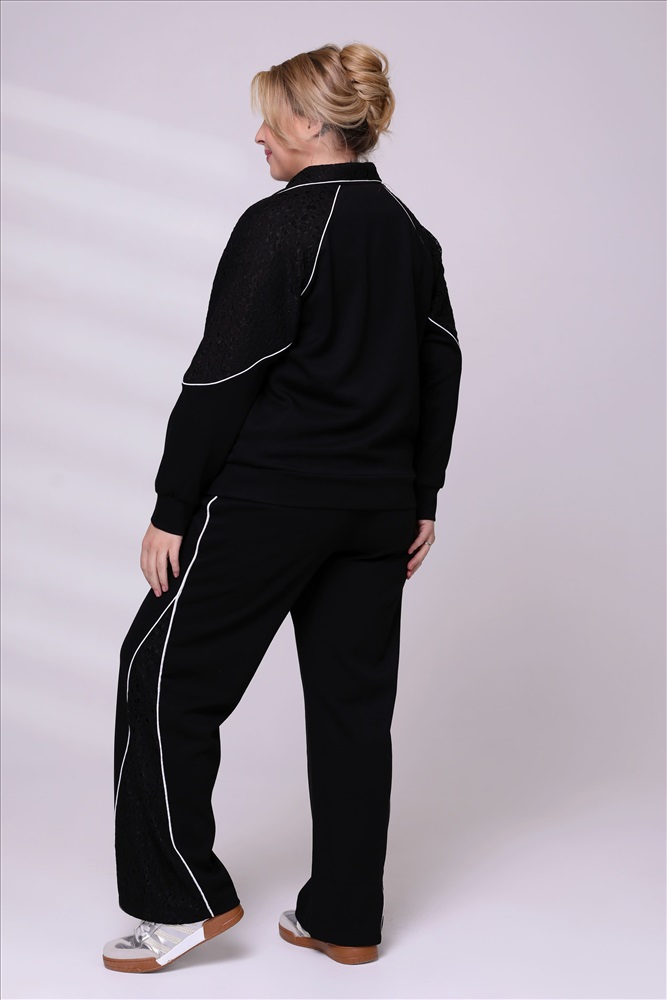 Стильная кофта присобрана по низу на притачную резинку. Круглый вырез дополнен стойкой-воротником, который защитит шею от ветра. Рукава-реглан полной длины по низу оформлены широкими манжетами. Кофта застёгивается спереди по всей длине на молнию. Контрастные строчки на кофте и брюках освежают образ и добавляют динамичности. Прорезные карманы оформлены листочками. Стильный костюм отлично подходит для тренировок и прогулок в прохладную ветреную погоду.