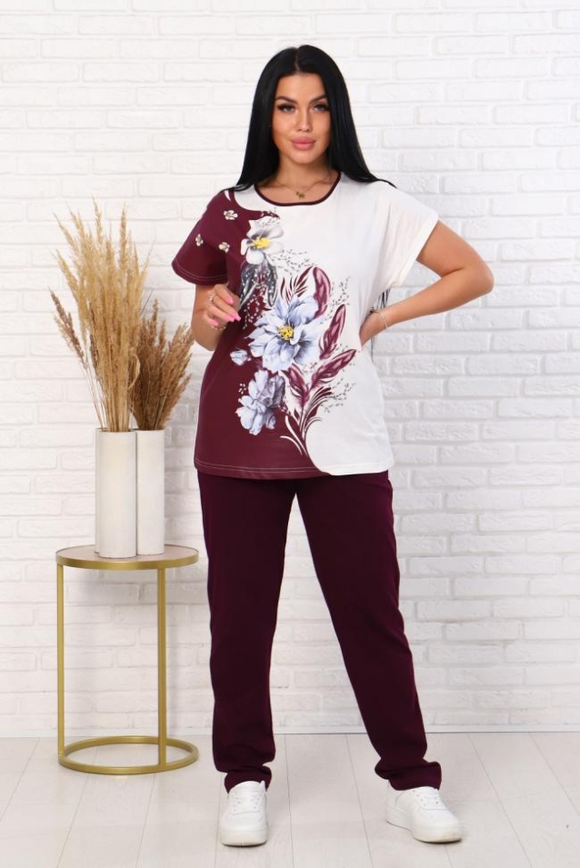 Женский костюм с брюками - идеальный вариант как домашней одежды, костюма для прогулок и путешествий, но так же и как пижама для сна. Для пошива используется ткань со 100% содержанием хлопка. Идеальное лекало костюма позволит подчеркнуть все достоинства фигуры, в то же время модель не сковывают движений и позволяет чувствовать себя комфортно в любых условиях. Особую изюминку изделию придает эффектный дизайн в виде сочетания двух контрастных друг к другу цветов, место стыка которых декорировано изображением прекрасного букета. Так приятно в конце рабочего дня сменить повседневный офисный костюм на такую мягкую и приятную трикотажную одежду!