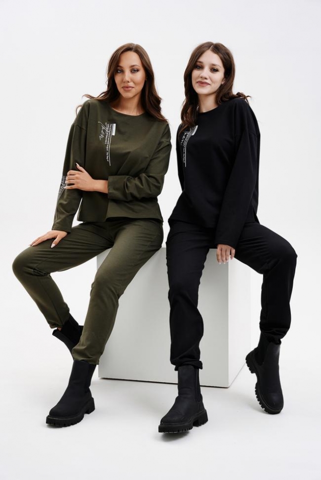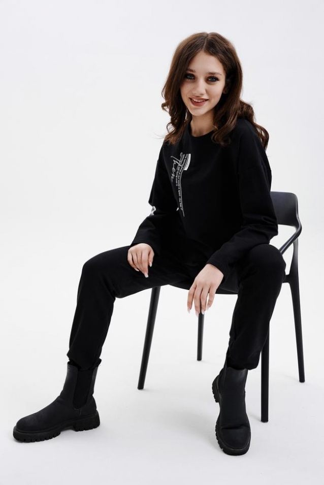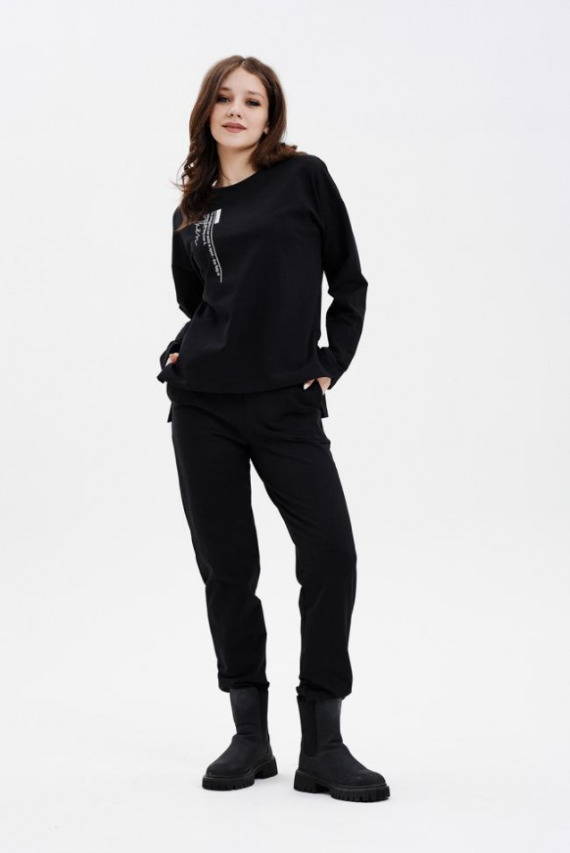 Стильный женский брючный костюм с оригинальным принтом выполнен в стиле спорт шик и умеренного oversize. Костюм состоит из укороченного спереди лонгслива с длинным рукавом, округлым вырезом горловины, разрезами по бокам и прямых брюк с удобной широкой резинкой на поясе с двумя боковыми карманами. Наш брючный костюм выполнен из мягкой трикотажной ткани. Благодаря свободному верху и удобной посадке брюк Вам будет комфортно носить костюм каждый день. Женский костюм двойка подходит для повседневной носки, работы в офисе или посещение школы, а также для торжественных мероприятий.
