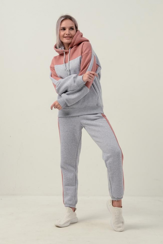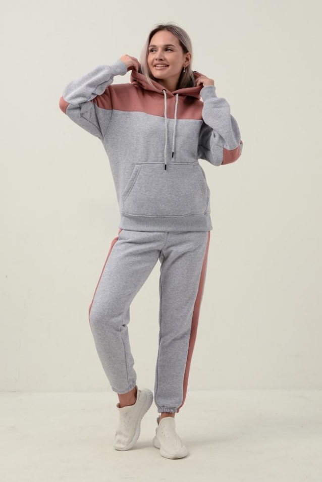 Стильный костюм из футера 3-х нитки. Костюм выполнен из мягкого хлопка с лицевой стороны и начесом с изнанки. Костюм состоит из двух вещей: худи с капюшоном с карманом кенгуру и брюки джоггер на резинке с прорезными карманами.