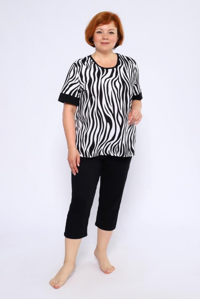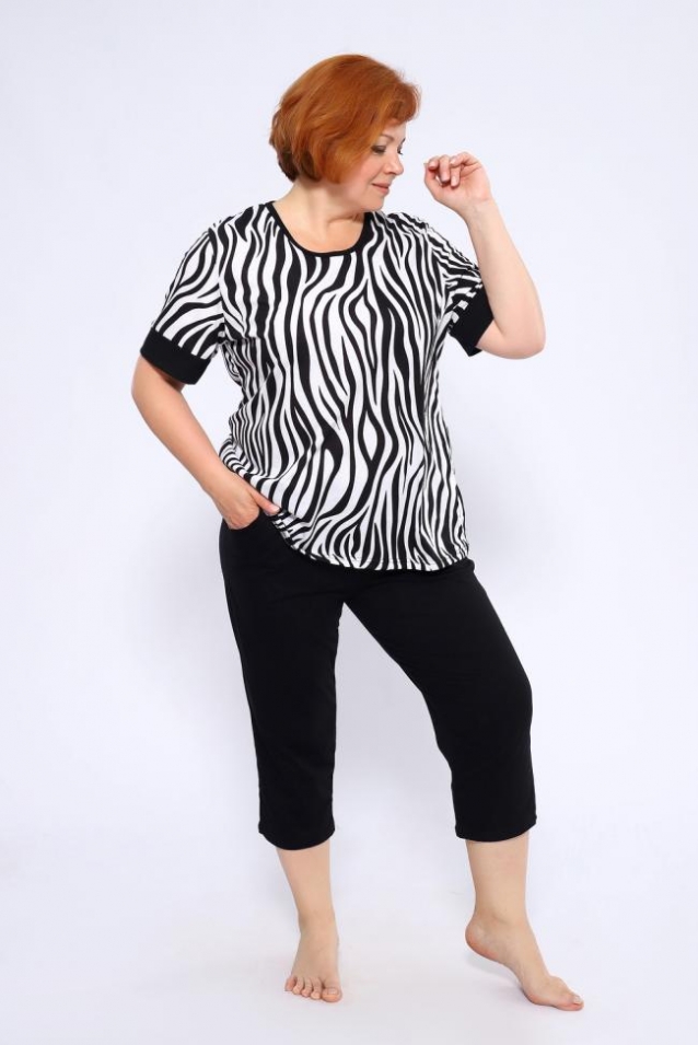 Женский костюм из кулирки футболка + бриджи. Футболка из набивной ткани с цветами, короткие рукава с манжетами, бриджи из однотонной ткани с карманами.