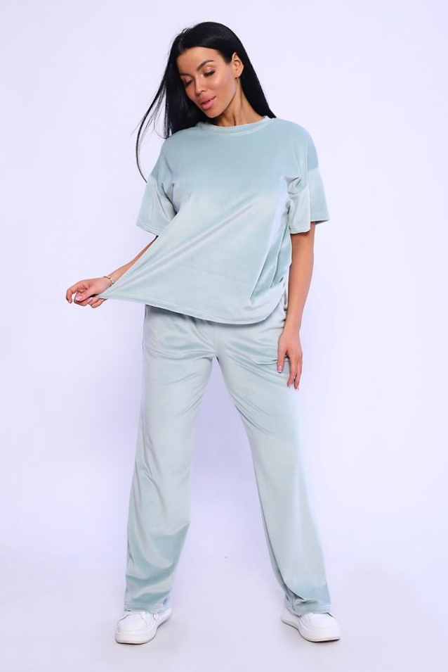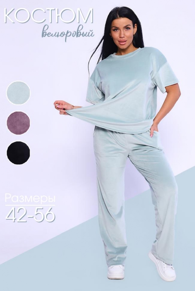 Костюм женский велюровый, повседневный, всесезонный. Костюм состоит из футболки и брюк. Футболка оверсайз прямого силуэта, длиной до бедра. Рукав втачной со спущенным плечом, длиной чуть выше локтя. Горловина с обтачкой, низ футболки с подгибкой. Брюки прямого силуэта, умеренного объема. На передних половинках брюк карманы с отрезным бочком. Пояс притачной с эластичной тесьмой. Низ брюк подгибка. Замеры объема талии брюк по нерастянутой резинке. Параметры модели 97-71-101. На модели представлен 48 размер.