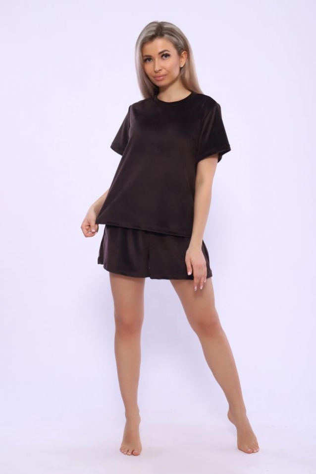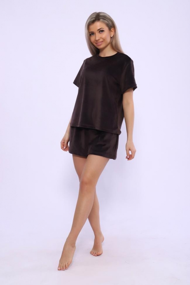 Костюм повседневный с шортами из мягкого велюра. В комплект входят: футболка с коротким рукавом с округлым вырезом горловины и шорты с карманами и поясом на резинке. Удобный велюровый костюм имеет свободный покрой, что делает его универсальной одеждой, которая подойдет на любую фигуру. Он не сковывает движения, скрывает недостатки и подчеркивает достоинства фигуры. Удобные шорты имеют комфортную посадку, резинка не давит, не скручивается, не перетягивает талию. Костюм универсальный, его приятно носить дома и на улице.