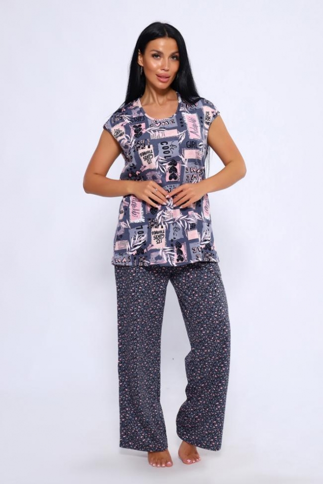 Женский костюм из 100% хлопка, длинные широкие брюки на эластичной резинке по талии шириной 3 см., с карманами в боковых швах и футболкой со спущенным плечом. Брюки в двух расцветках. Интересное и актуальное цветовое сочетание серых и розовых оттенков отличный вариант. Брюки и футболку можно сочетать и с другими предметами вашего гардероба. Ткань не просвечивает и имеет эластичность, обеспечит комфортное времяпрепровождение вашего досуга как дома так и на отдыхе. На фото модель представлена в 48 размере.