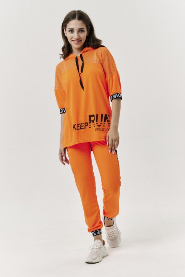 Костюм состоит из туники и брюк. Туника прямая, свободная, с капюшоном из сетки, с удлиненной спинкой. Рукав короткий, обработанный декоративной резинкой. Кокетка полочки выполнена из сетки. Вдоль центра спинки расположена декоративная вставка из отделочного полотна и сетки. Брюки свободные, длинные, с карманами, на эластичном поясе. Низ брюк обработан декоративной резинкой. Вдоль боковых швов расположен лампас из отделочного полотна и сетки. В средней части лампаса расположен карман.