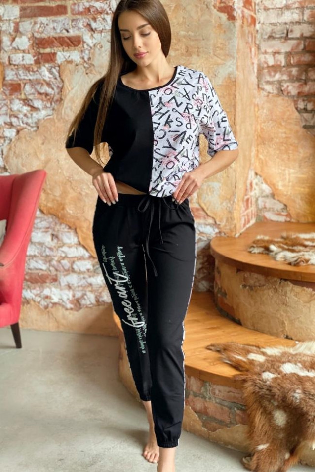 Костюм состоит из футболки и брюк. Футболка прямая, с округлой горловиной. Половина полочки выполнена из отделочного полотна. По низу обработана кулиса со шнуром-стяжкой. Шнур и горловина обработаны бейкой из отделочного полотна. Брюки выполнены из отделочного полотна. Брюки свободные, длинные, с карманами, на эластичном поясе, с резинкой по низу. Вдоль боковых швов расположен лампас из основного полотна.