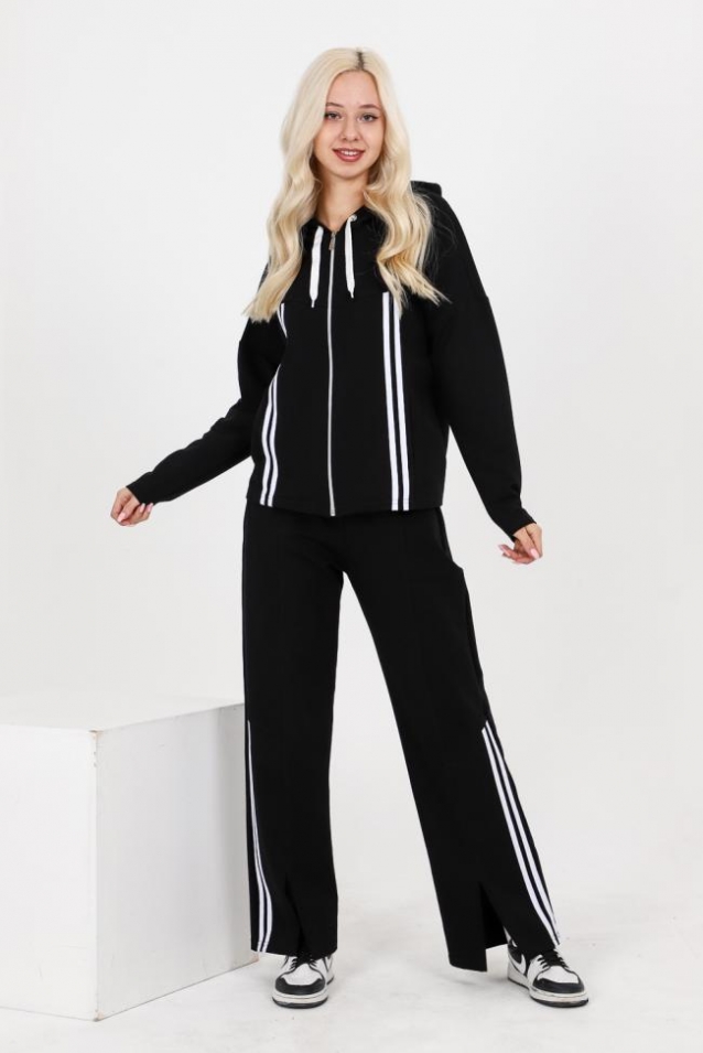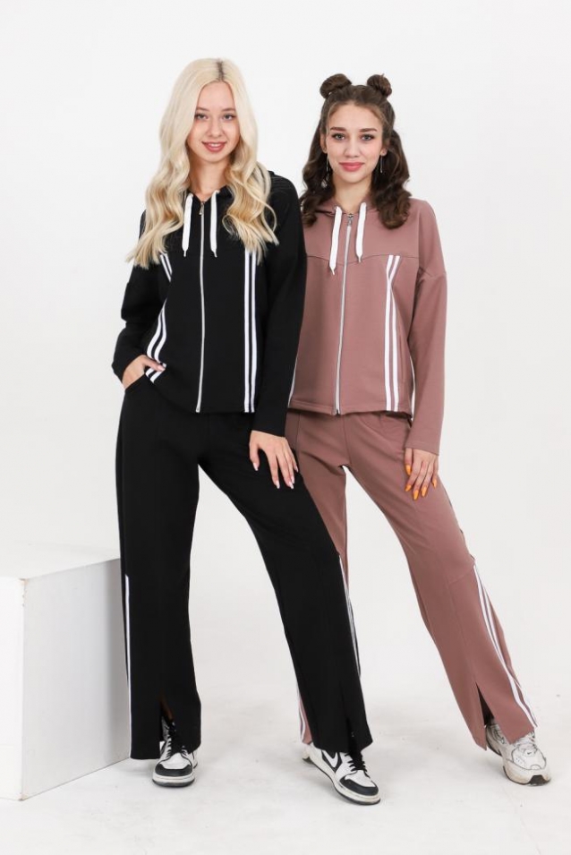 Костюм состоит из толстовки и брюк. Толстовка прямая, свободная, с капюшоном, на молнии. Полочка с кокетками и вертикальными рельефами. В рельефных швах обработаны карманы. Рукав длинный. Низ спинки обработан поясом. Брюки свободные, прямые, с боковыми карманами, на поясе. В нижней части передних половинок брюк обработаны разрезы.