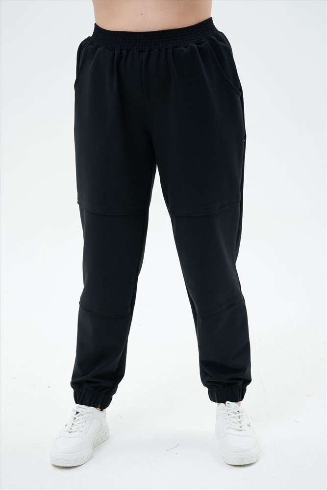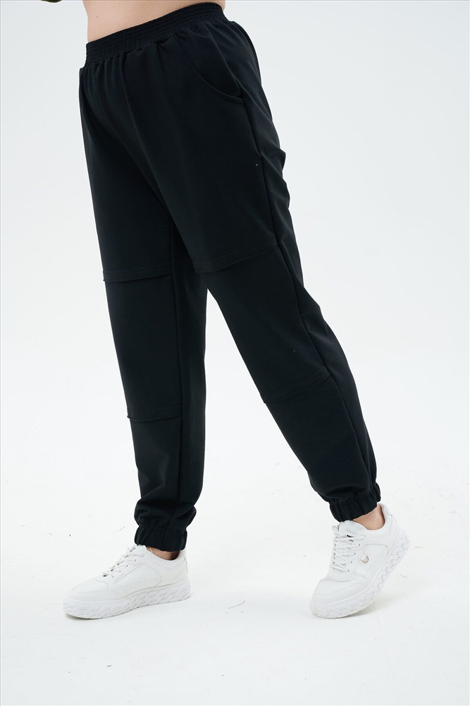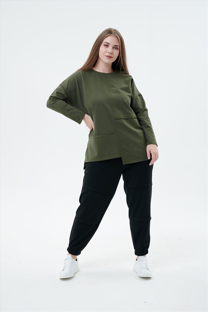 Костюм женский: туника и брюки. Туника прямого силуэта, горловина круглая, рукав длинный, цельнокроеный со швом., состоит из передней и задней частей. Полочка из четырех частей: на правой части внутренний горизонтальный карман в шве, на левой горизонтальный шов с открытыми срезами, аналогичный шов на спинке и на передней части брюк. В боковых швах разрезы. Брюки свободные по бедрам, зауженные к низу, на передней части брюк внутренние карманы. Пояс выполнен на многоигольной машине.