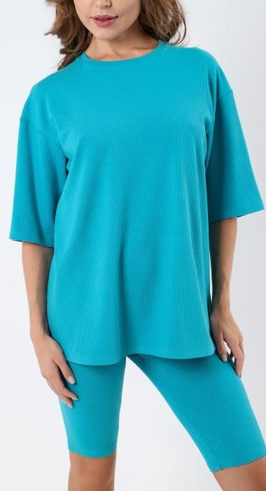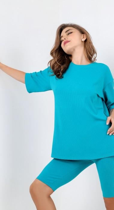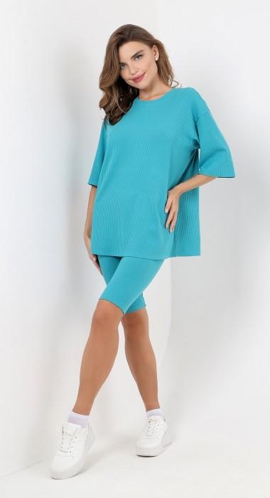 Костюм женский из гладкокрашенного трикотажного полотна в рубчик («лапша»), состоящий из футболки и леггинсов. Футболка – удлиненная, свободного покроя, со спущенной, линией плеча, короткими втачными рукавами, горловиной овальной формы, обработанной втачной планкой.Леггинсы – длиной до колен, с эластичной тесьмой по талии. Комментарии к товару