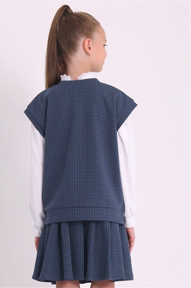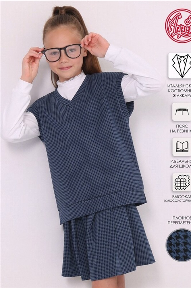 Комплект для девочки из жилета и юбки выполнен из плотного полотна с рельефным рисунком, выполненным с применением жаккардового плетения. Жилет прямого кроя с v-образным вырезом горловины, без карманов и со спущенной линией плеча. Юбка трапециевидного силуэта, длиной до середины бедра, на комфортном эластичном поясе. Отличный вариант для школы и не только! Уход: только машинная стирка (руками не стирать!) при температуре 40 градусов, без предварительного замачивания. Материал: жаккард