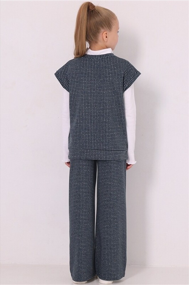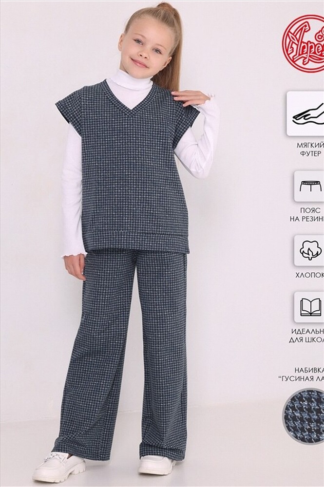 ID товара: 1037118 Состав: Хлопок 95%, Лайкра 5% Сезон: Весна/Лето Длина: Полная Фасон: Свободный крой Рукав: Без рукавов Посадка: Средняя Крой брючин: Прямой Рисунок: Гусиная лапка Основная ткань: Хлопок Стиль: Повседневный Страна бренда: Россия Страна производства: Россия Комплект для девочки из жилета и брюк выполнен из плотного полотна с рельефным рисунком. Жилет прямого кроя с v-образным вырезом горловины, без карманов и со спущенной линией плеча. Брюки-палаццо без карманов на удобном эластичном поясе. Отличный вариант для школы и не только!Уход: только машинная стирка(руками не стирать!) при температуре 40 градусов, без предварительного замачивания. Комментарии к товару