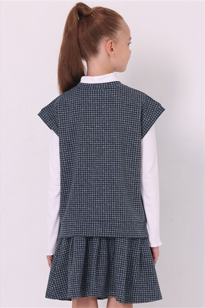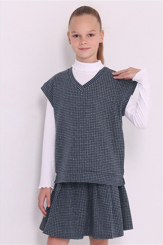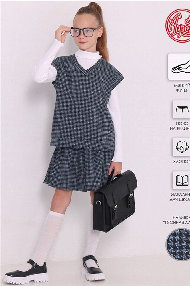 Комплект для девочки из жилета и юбки выполнен из футера - мягкого плотного хлопкового полотна с лайкрой. Жилет прямого кроя с v-образным вырезом горловины, без карманов и со спущенной линией плеча. Юбка трапециевидного силуэта, длиной до середины бедра, на комфортном эластичном поясе. Отличный вариант для школы и не только! Уход: только машинная стирка (руками не стирать!) при температуре 40 градусов, без предварительного замачивания. Материал: футер