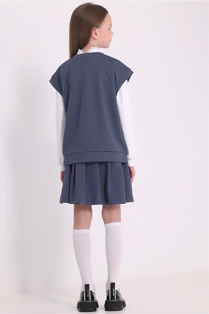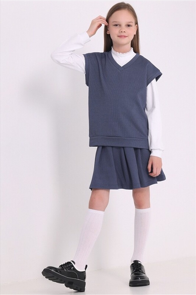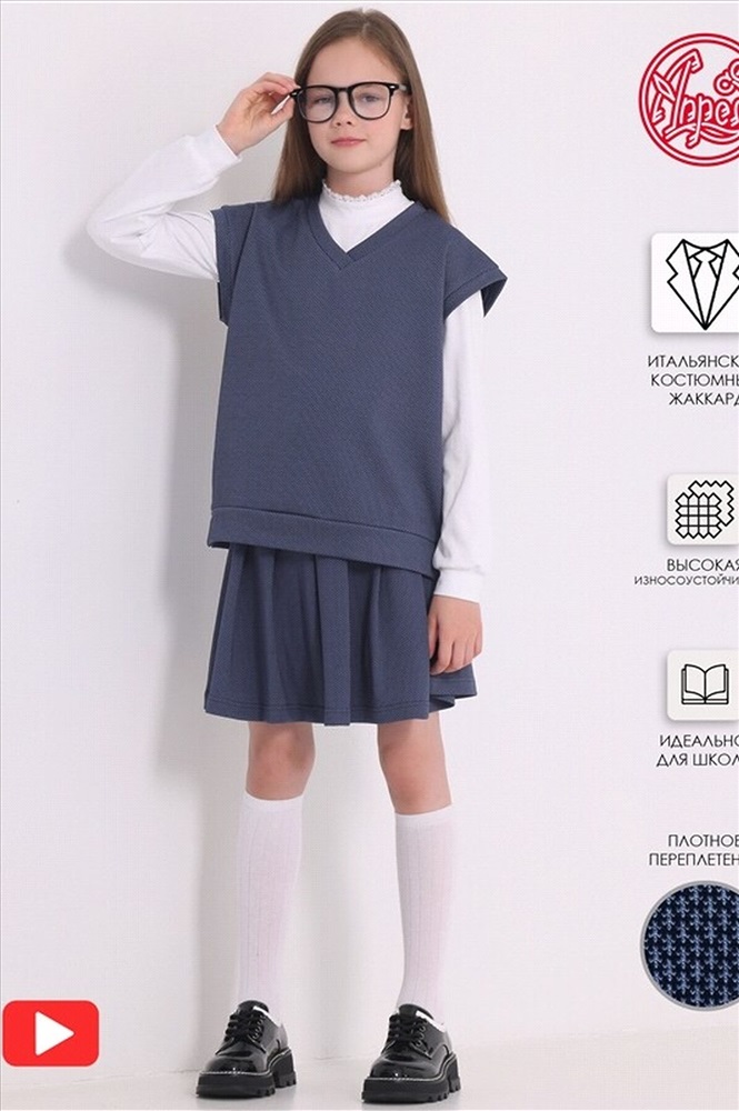 Комплект для девочки из жилета и юбки выполнен из плотного полотна с рельефным рисунком, выполненным с применением жаккардового плетения. Жилет прямого кроя с v-образным вырезом горловины, без карманов и со спущенной линией плеча. Юбка трапециевидного силуэта, длиной до середины бедра, на комфортном эластичном поясе. Отличный вариант для школы и не только! Уход: только машинная стирка (руками не стирать!) при температуре 40 градусов, без предварительного замачивания. Материал: жаккард