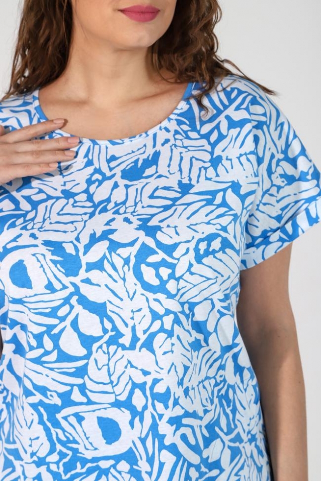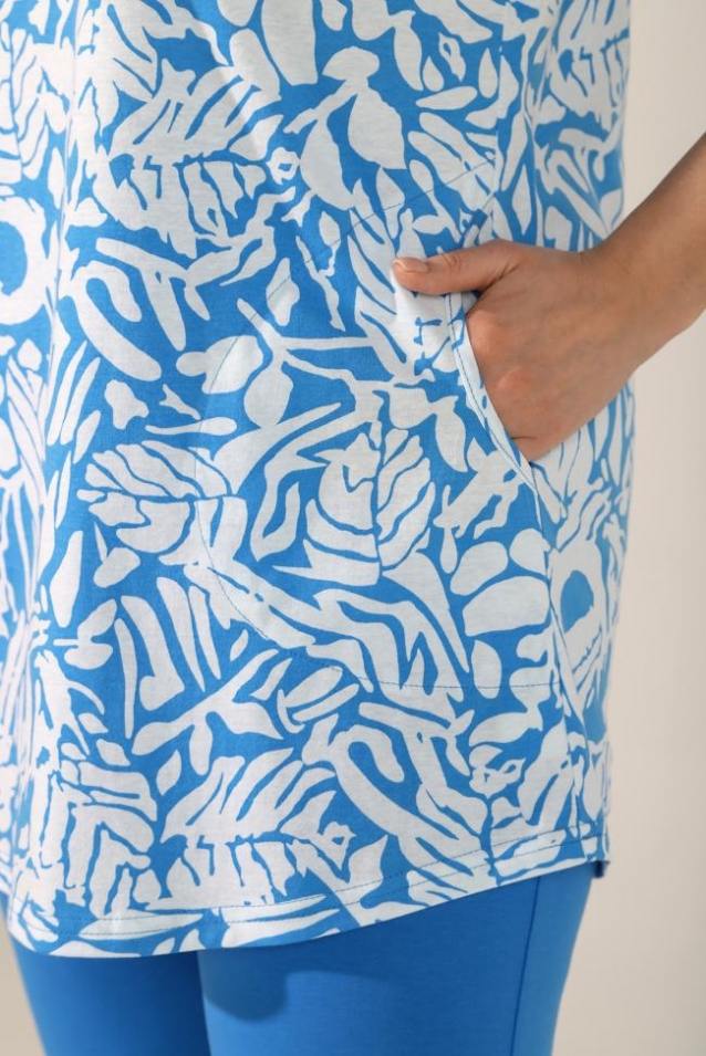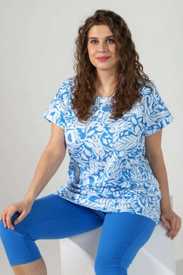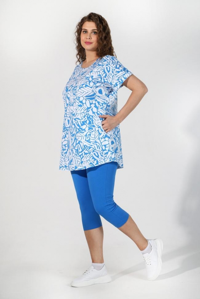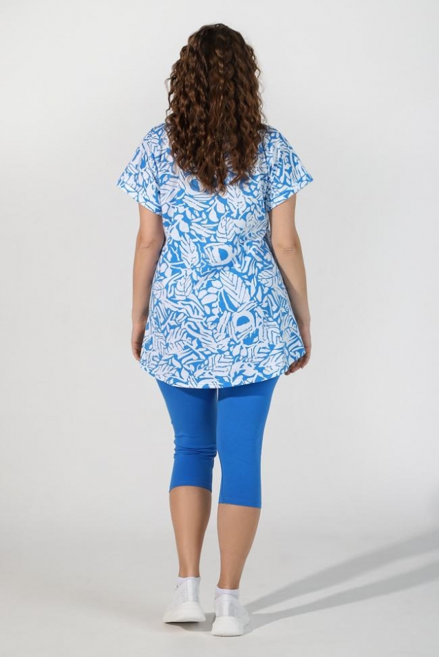 Из трикотажного полотна «кулирка» в комбинации двух видов: гладкокрашенного и с набивным рисунком, состоящий из туники и бриджей. Туника - из набивного полотна, свободного покроя, слегка расширенная книзу, с короткими цельнокроеными рукавами на притачных манжетах, окантованной горловиной овальной формы, карманами в боковых швах и фигурной линией низа. Бриджи – из полотна «кулирка» с лайкрой классического покроя, на резинке.