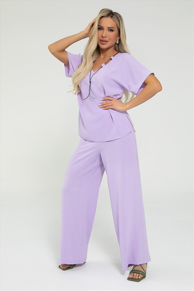 Артикул: К12671-15. Тип ткани: синтетический. Состав: 95% полиэстер, 5% эластан. Материал: сингапур - лёгкая ткань с жатой текстурой. Цвет: лавандовый. Принт: отсутствует. Вид застежки: без застёжки. Карманы: отсутствуют. Резинка в поясе: есть. Силуэт: свободный. Декоративные элементы: замшевый шнурок в петельках на горловине. Длина блузы по спинке от верхней точки плеча: 48/ 65 см, 50/ 66 см, 52/ 67 см, 54/ 68 см, 56/ 69 см. Длина брюк с учётом резинки по боковому шву: 48-56/ 108 см.