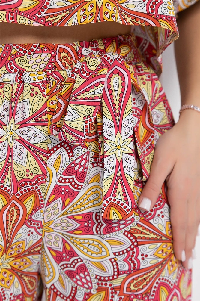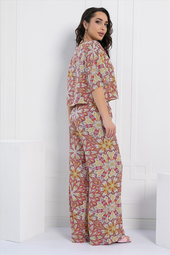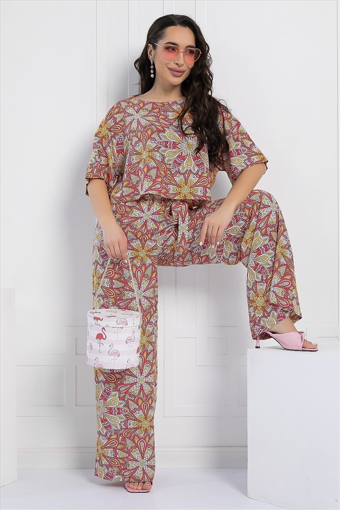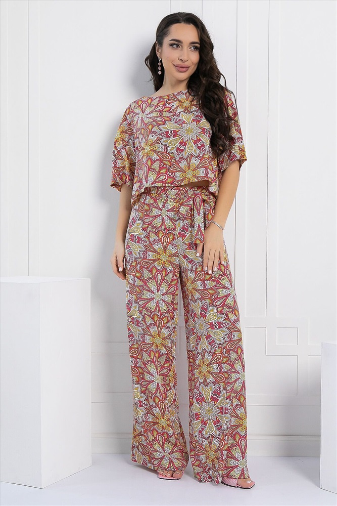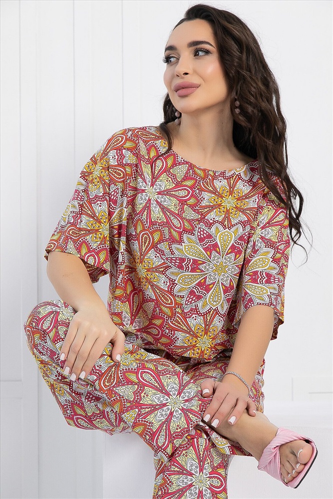 ID товара: 1096090 Состав: 100% Хлопок Сезон: Весна/Лето Длина: Полная Фасон: Свободный Рукав: короткие Крой брючин: Широкий Рисунок: Узор Декоративные элементы: Принт Основная ткань: Хлопок Стиль: повседневный Страна бренда: Россия Страна производства: Россия Артикул: К12970-8М. Тип ткани: натуральный. Состав: 100% хлопок. Материал: штапель. Цвет: красный. Принт: узоры. Вид застежки: без застёжки. Карманы: отсутствуют. Резинка в поясе: есть. Силуэт: свободный. Декоративные элементы: отсутствуют. Длина блузы по спинке от верхней точки плеча: 44/ 46 см, 46/ 47 см, 48/ 48 см, 50/ 49 см, 52/ 50 см, 54/ 51 см. Длина брюк по боковому шву: 44-54/ 101 см. Размер изделия на модели: 44 Рост модели: 167 см. Костюм из лёгкой ткани идеально подойдёт для летнего расслабленного образа. Блуза свободного кроя с округлой горловиной, с втачным коротким рукавом рубашечного типа. Брюки прямого кроя, по талии на резинке, с притачными полупоясами по боковым швам, которые завязываются спереди на бант. Свободный крой не сковывает движений и дарит комфорт. Уход за изделием: ручная стирка до 30 градусов; нельзя отбеливать; отжим запрещён; гладить при t не более 110 С; гладить с изнанки. Внимание! Рекомендуем ориентироваться на размерную сетку и выбирать свой привычный размер, согласно размерной таблице. *Допуск отклонения длины при массовом производстве 1-3 см является нормой. Комментарии к товару