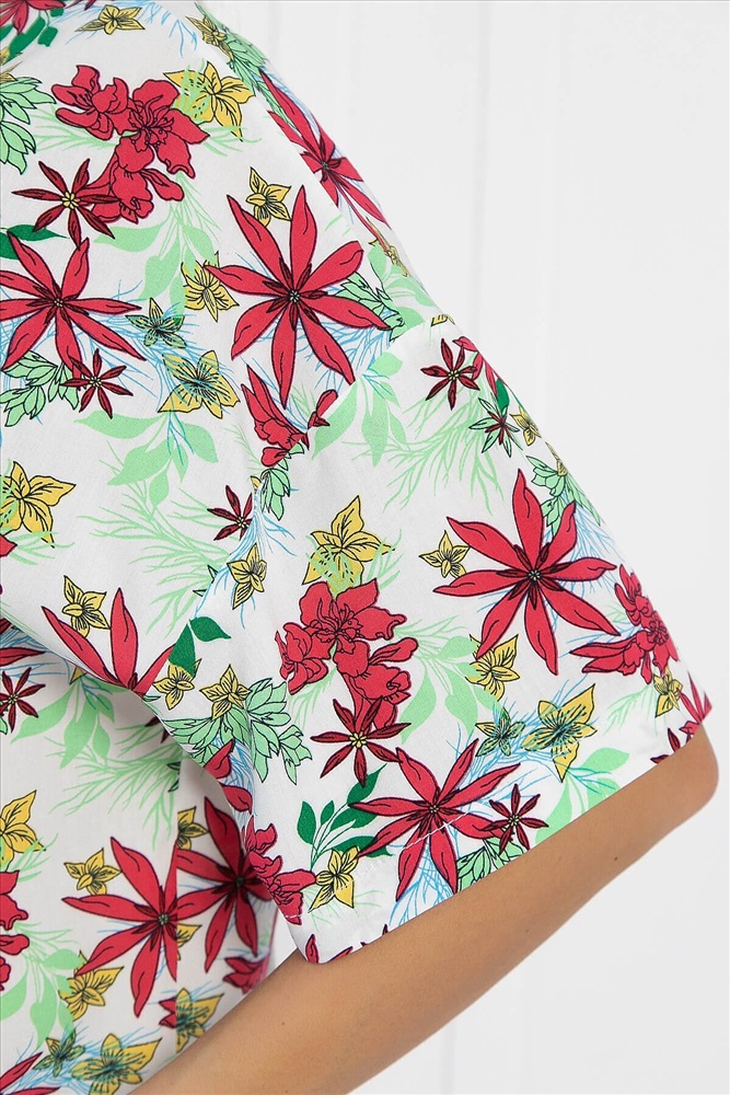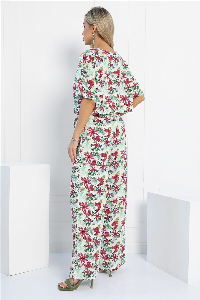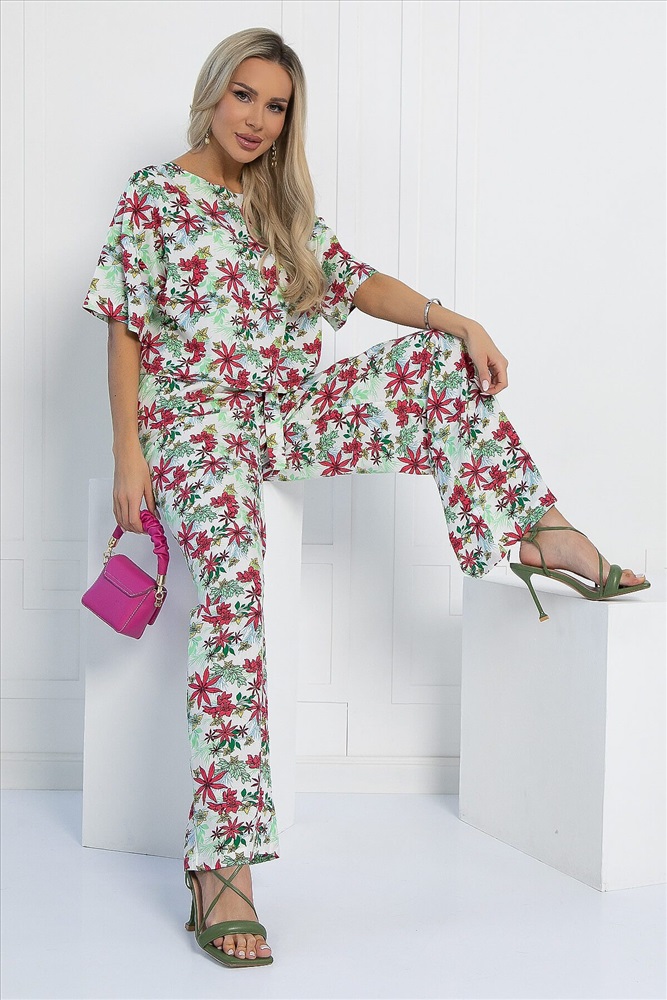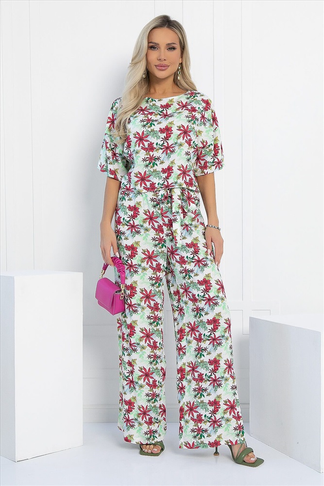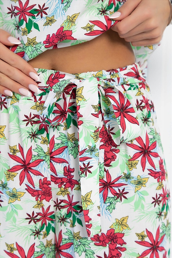 Артикул: К12968-8М. Тип ткани: натуральный. Состав: 100% хлопок. Материал: штапель. Цвет: белый. Принт: цветы. Вид застежки: без застёжки. Карманы: отсутствуют. Резинка в поясе: есть. Силуэт: свободный. Декоративные элементы: отсутствуют. Длина блузы по спинке от верхней точки плеча: 44/ 46 см, 46/ 47 см, 48/ 48 см, 50/ 49 см, 52/ 50 см, 54/ 51 см. Длина брюк по боковому шву: 44-54/ 101 см.