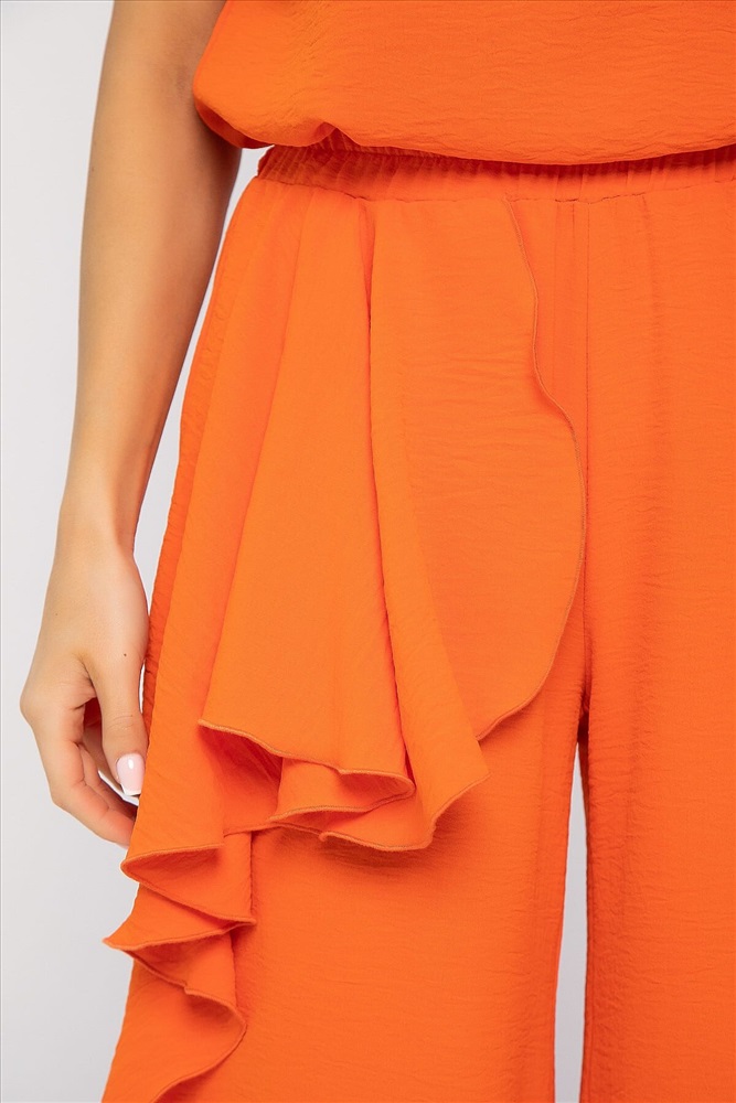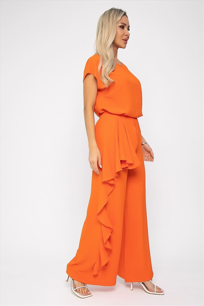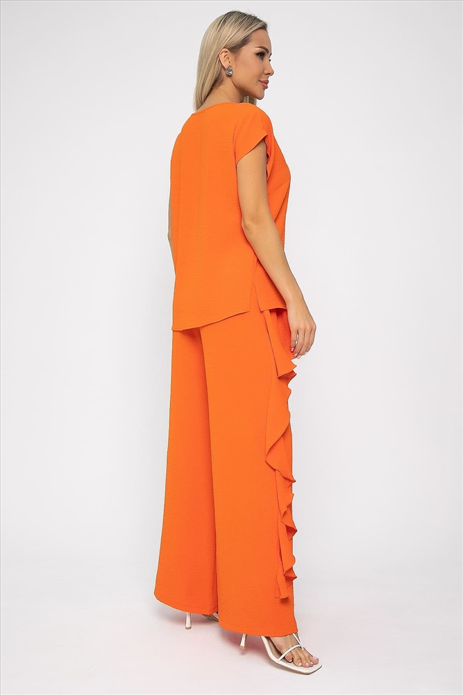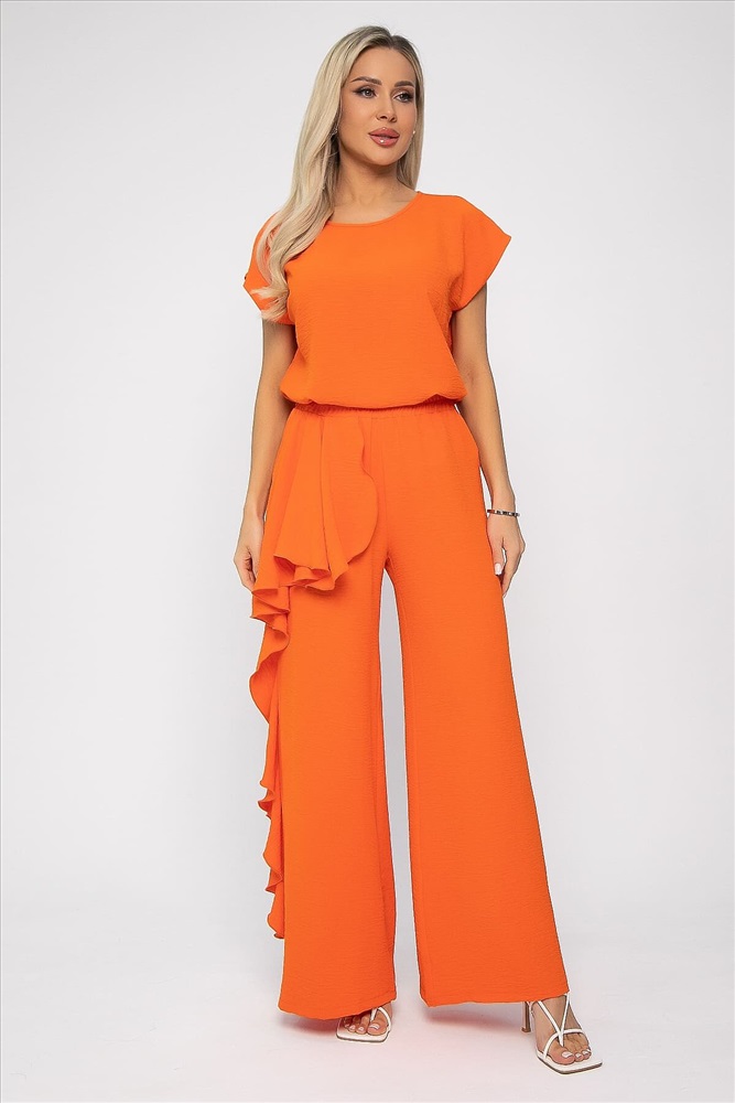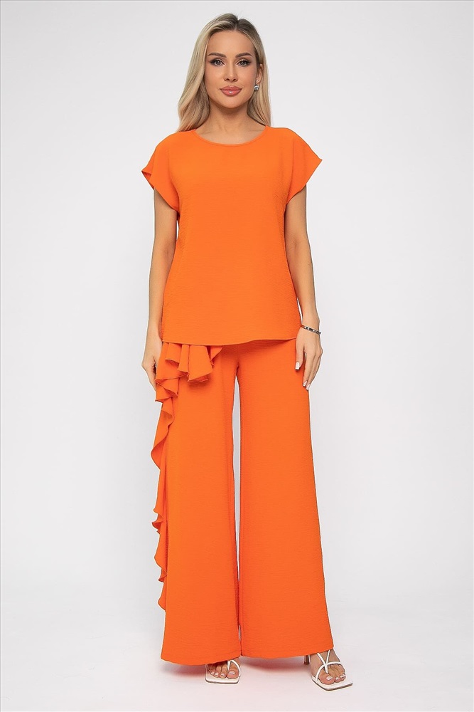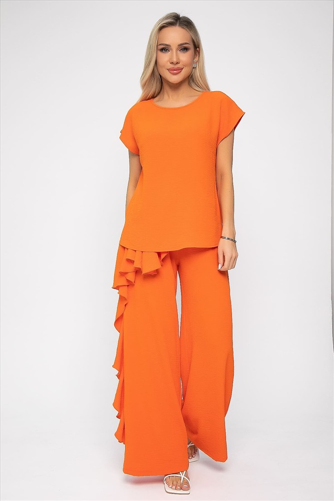 Костюм оранжевого оттенка универсален: подходит как для повседневных выходов, так и для особых случаев. Брюки прямого кроя, на резинке по талии, с воланом сбоку. Удобный и стильный дизайн идеально подойдет для повседневной носки. Блуза с коротким и цельнокроеным рукавом, идеально дополняет брюки и создает завершенный образ. Легкая и комфортная ткань обеспечит вам комфорт в течение дня.