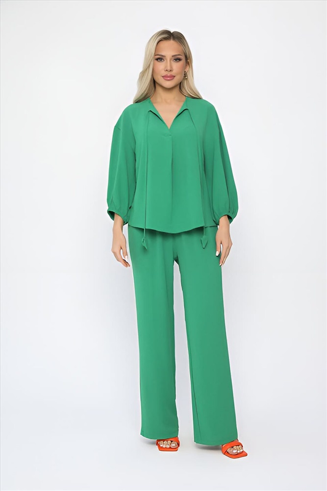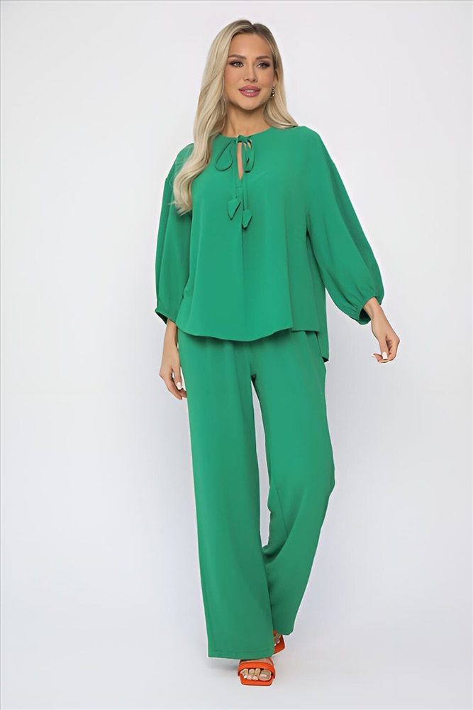ID товара: 1125860 Состав: 60% Полиэстер, 40% Хлопок Сезон: Весна/Лето Длина: Полная Фасон: Свободный Рукав: 3/4 Крой брючин: Широкий Основная ткань: Полиэстер Стиль: классический Страна бренда: Россия Страна производства: Россия Состав : 60% полиэстер, 40% хлопок Материал : жатка Цвет : Зеленый Принт : отсутствует Силуэт : свободный Карманы : Отсутствуют Подкладка : Отсутствует Резинка в поясе : Да Вид застежки : на блузке по горловине спереди завязка Декоративные элементы : складка на груди Женский костюм из жатой ткани. Блузка свободного силуэта с ассиметричным низом. Рукава 3/4 оформлены по низу на резиночке. Вырез горловины по переду блузки V-образной формы со складкой. Также оформлен завязками с декоративными элементами на концах. Брюки прямого кроя. Пояс на резинке подчеркивает талию и создает идеальную посадку, благодаря чему вы будете чувствовать себя уютно и уверенно. Этот костюм идеально подходит как для повседневных выходов, так и для более торжественных мероприятий. Внимание! Рекомендуем ориентироваться на размерную сетку и выбирать свой привычный размер, согласно размерной таблице. *Допуск отклонения длины при массовом производстве 1-3 см является нормой. Уход за изделием: Ручная стирка или стирка в машине при температуре до 30 °C, деликатный режим. Не использовать отбеливатели. Разрешена глажка при температуре до 110 °C. При глажке использовать специальную насадку на подошве утюга, гладить с паром. Не замачивать и не выжимать. Стирать изделие наизнанку, отдельно от других вещей. Комментарии к товару