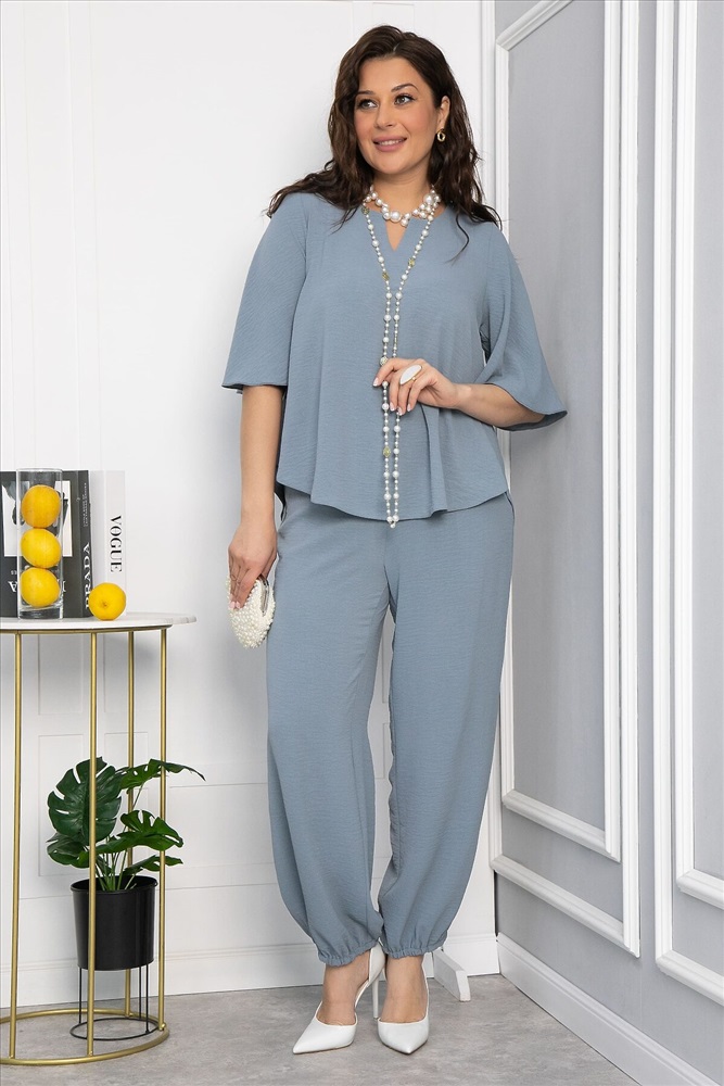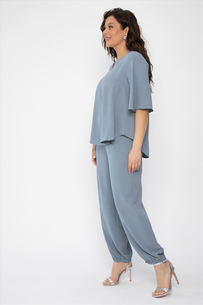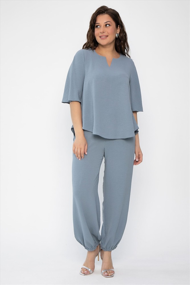 Легкий, приятный к телу брючный костюм в серо-голубом оттенке, преимущественно из хлопка, покорит вас с первого прикосновения. Блуза свободного кроя с воздушными фалдами имеет рукав средней длины и V-образный вырез. Свободные брюки в стиле палаццо придают костюму легкость и особый шик. Брюки имеют пояс на комфортной резинке, что позволяет чувствовать себя свободно и не сомневаться при выборе размера. Низ брюк деликатно собран резинкой, которую по желанию можно растянуть/стянуть по размеру своей ножки или вовсе убрать, и тогда у вас получатся прямые к низу брюки. Свободный силуэт костюма подходит абсолютно для любой фигуры. Костюм актуален для любого мероприятия, романтических встреч и летних прогулок..