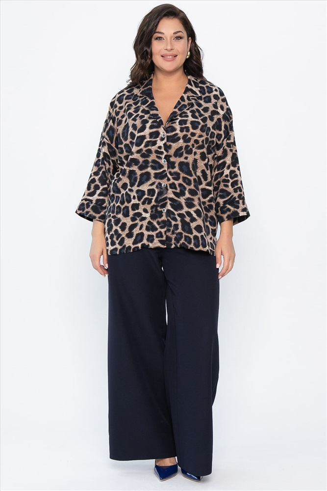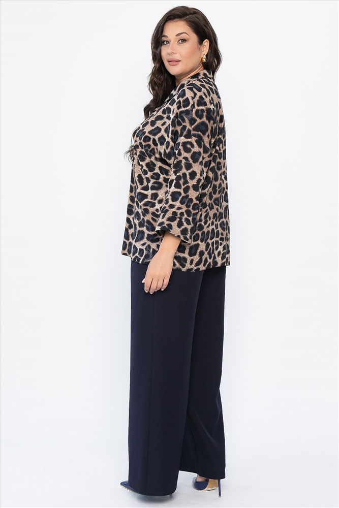 В таком костюме вы не останетесь незамеченной! Универсальный фасон позволит вам создать множество образов и использовать отдельно брюки и блузку. Благодаря крою комплект прекрасно садится и смотрится на разных фигурах. Красивое сочетание синего цвета с леопардовым принтом придаёт изюминку изделию. В комплекте пояс, с помощью которого можно сделать акцент на талии.