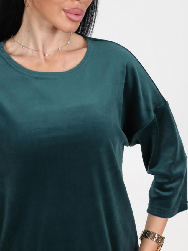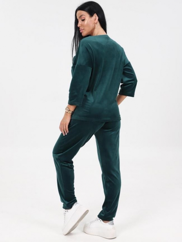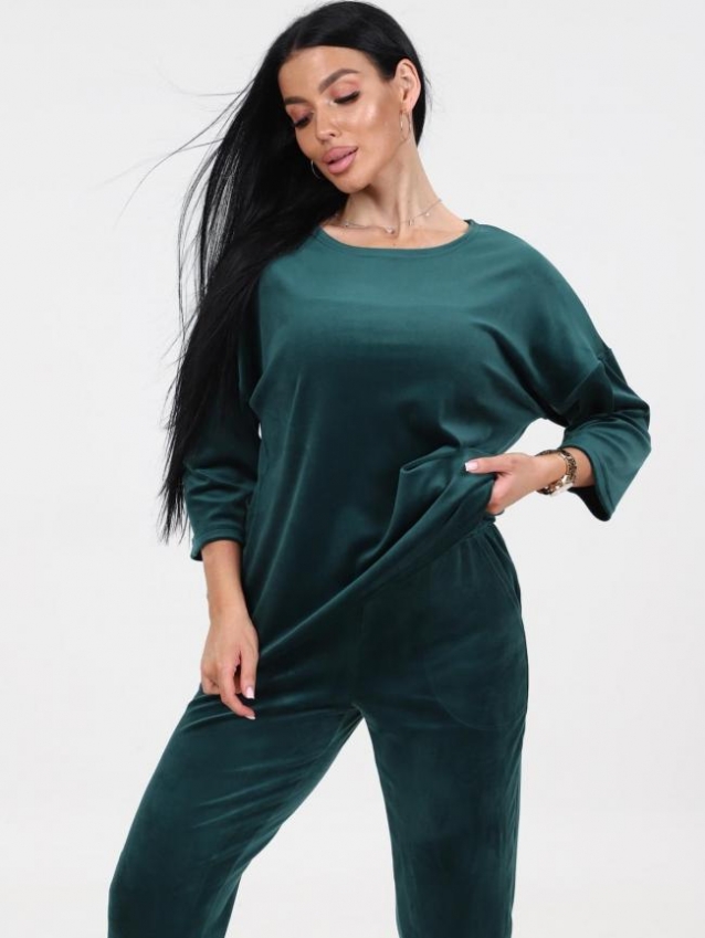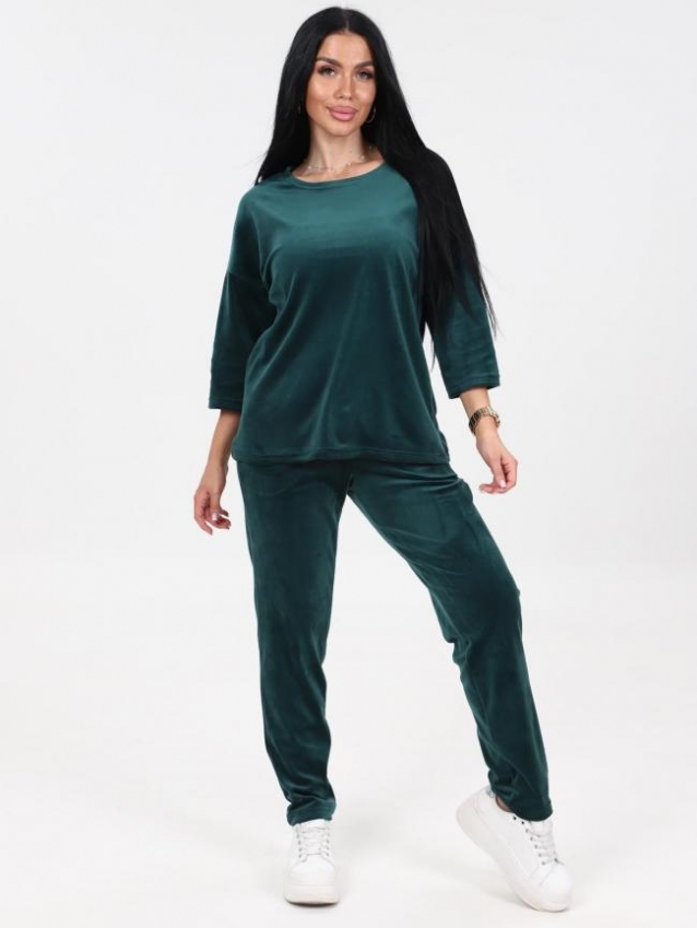 Женский трикотажный костюм состоит из кофты и брюк. Кофта прямого силуэта со спущенной линией плеча. Рукав 3/4. Брюки с карманами в боковых швах, верх на эластичной тесьме.