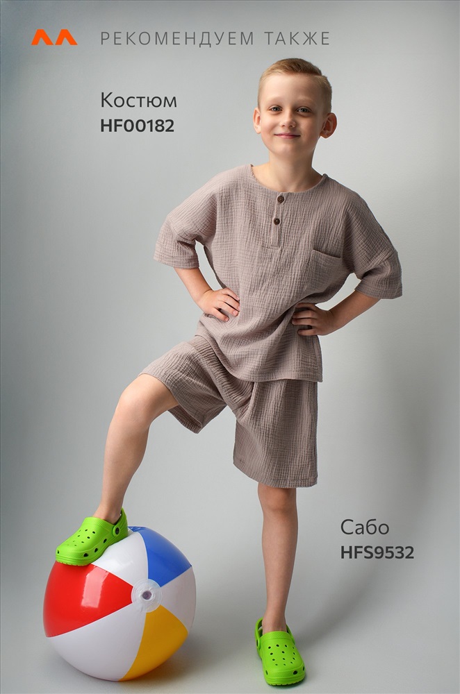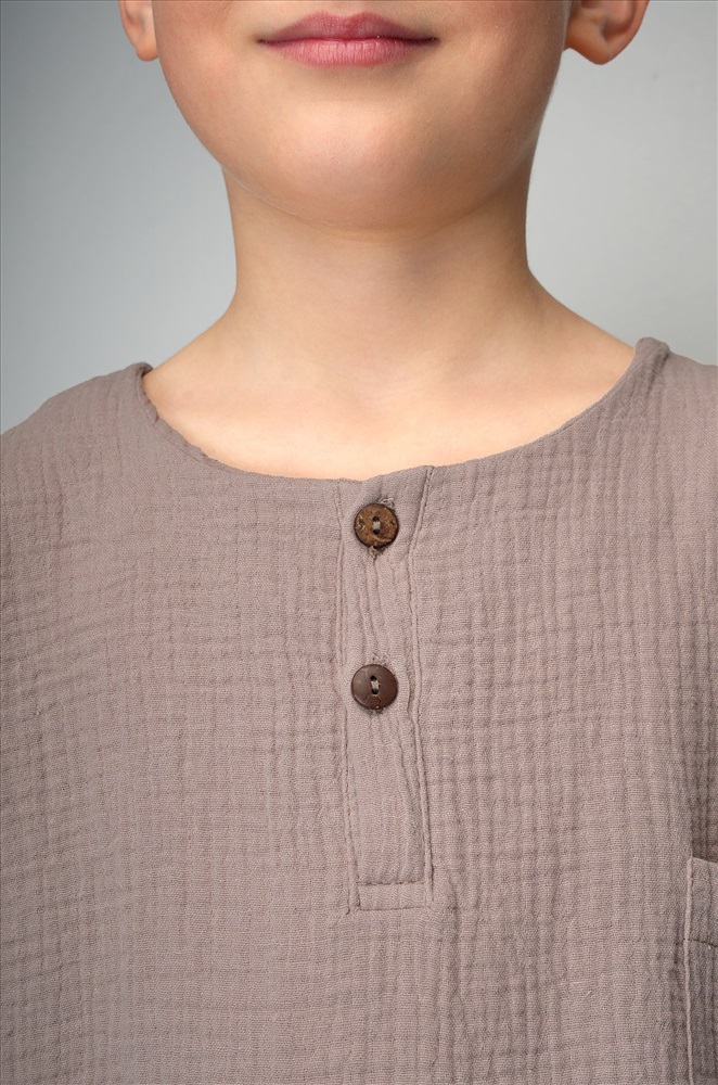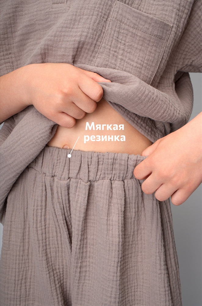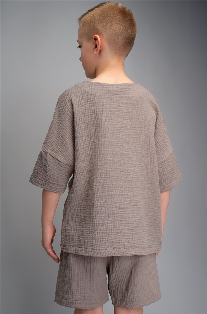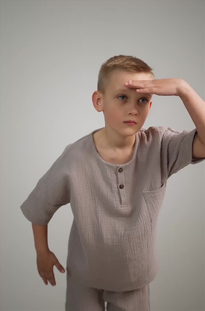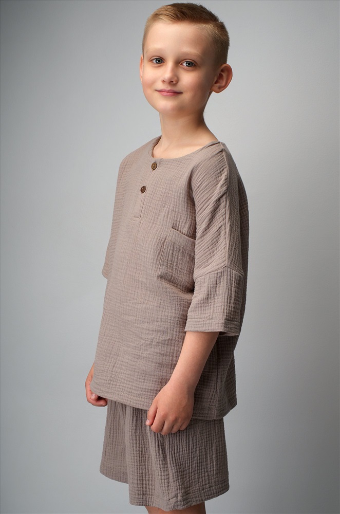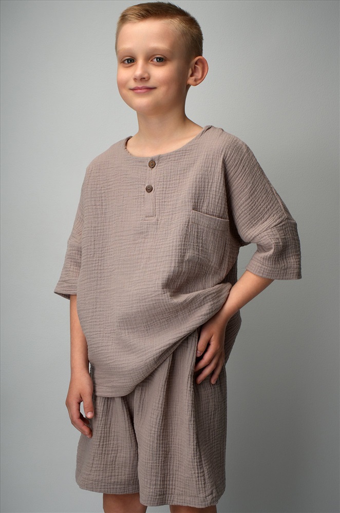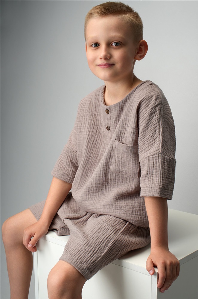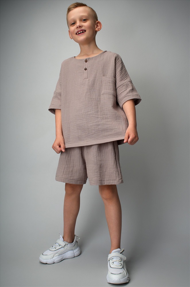 Летний костюм с шортами выполнен из ткани муслин, 100% хлопка. Ткань отличается мягкостью и дышащими свойствами. С хлопковой тканью жатка можно спокойно забыть про глажку — муслин отлично держит форму, оставаясь аккуратным и стильным даже после многократных стирок. Футболка свободного кроя оверсайз с короткими рукавами и застежкой на пуговицы добавляет комфорт и свободу движений. Спущенное плечо и нагрудный карман придают стильный акцент. Удлинённые шорты прямого кроя с резинкой на поясе — комфортный и практичный выбор для игр и отдыха. Муслиновый костюм станет идеальным решением для прогулок в парке, игр во дворе или поездок на природу. Легкий хлопковый костюм — отличный выбор на каждый день.