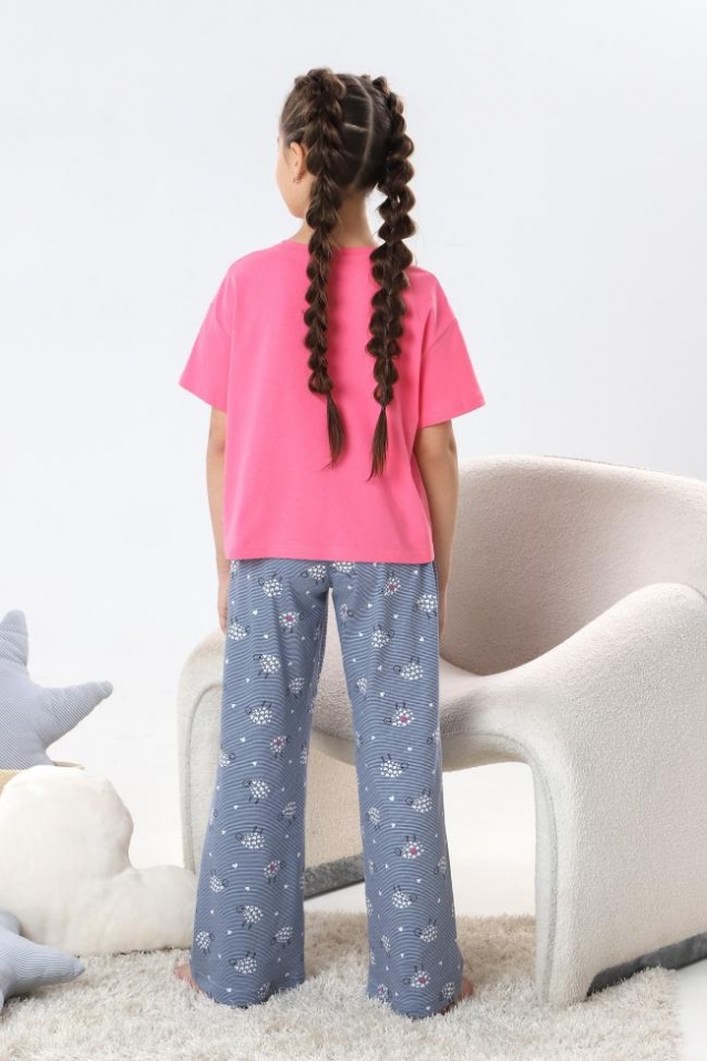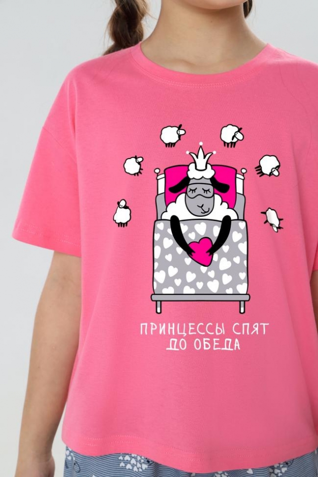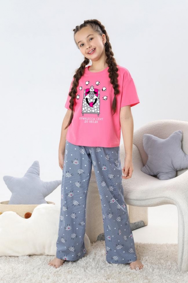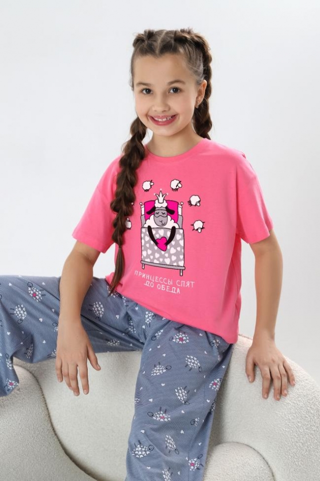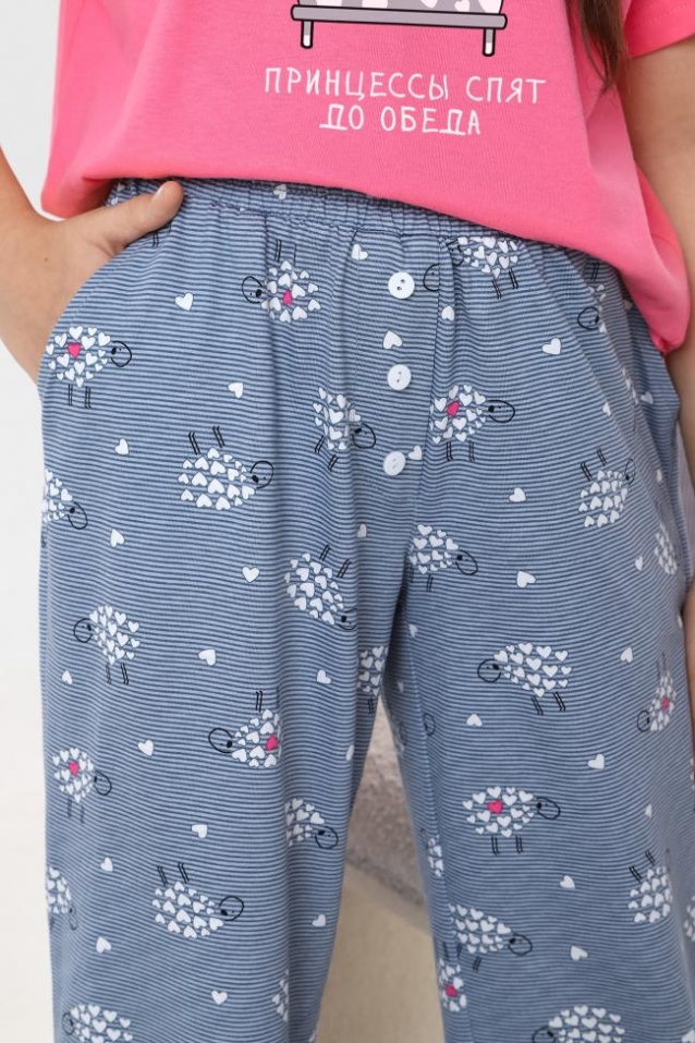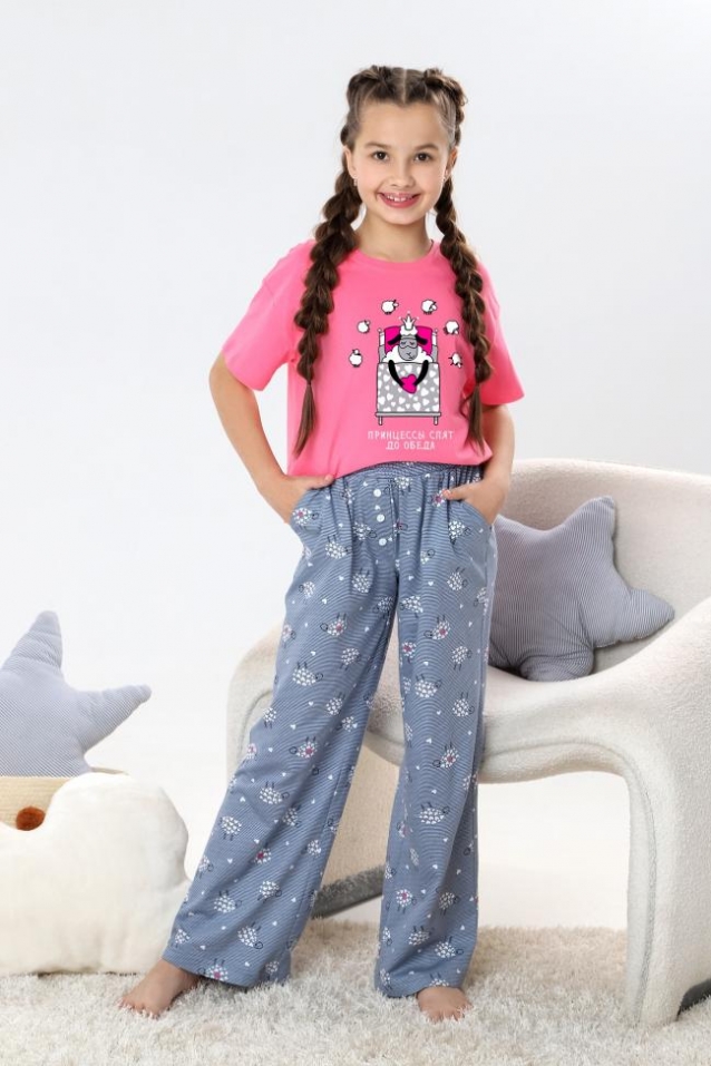 Костюм для девочки, состоящий из футболки и брюк. Футболка - из гладкокрашеного полотна с принтом на детали переда, свободного покроя, укороченная, с коротким втачными рукавами и горловиной овальной формы, обработанной втачной бейкой. Нижние срезы рукавов и изделия обработаны швом вподгибку. Брюки из полотна с набивным рисунком, длинные, на притачном поясе с эластичной тесьмой внутри и карманами в боковых швах. Средний шов передних половин обработан с имитацией застежки "гульфик" с тремя декоративными пуговицами. Нижние срезы шорт обработаны швом вподгибку.