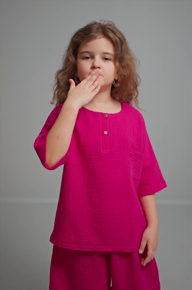 Малиновый костюм с шортами для девочки — это настоящая находка на всё лето! Футболка свободного кроя оверсайз со спущенным плечом и круглым вырезом выглядит очень стильно, а застежка на планку с пуговицами добавляет шарма. Шорты широкие, с удобным поясом на резинке, поэтому в таком комплекте можно носиться хоть целый день.
