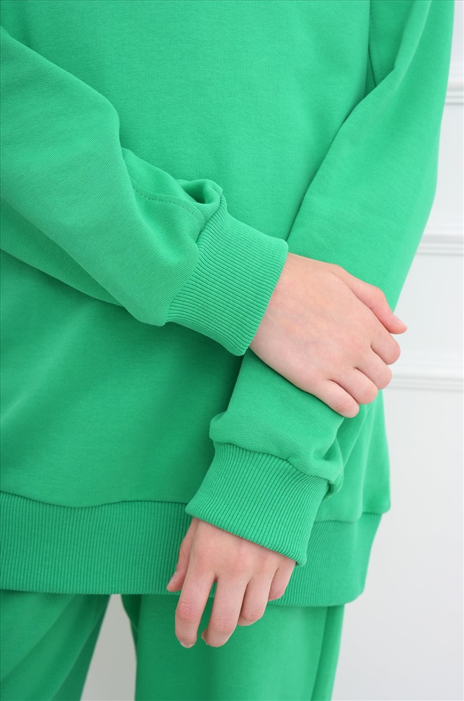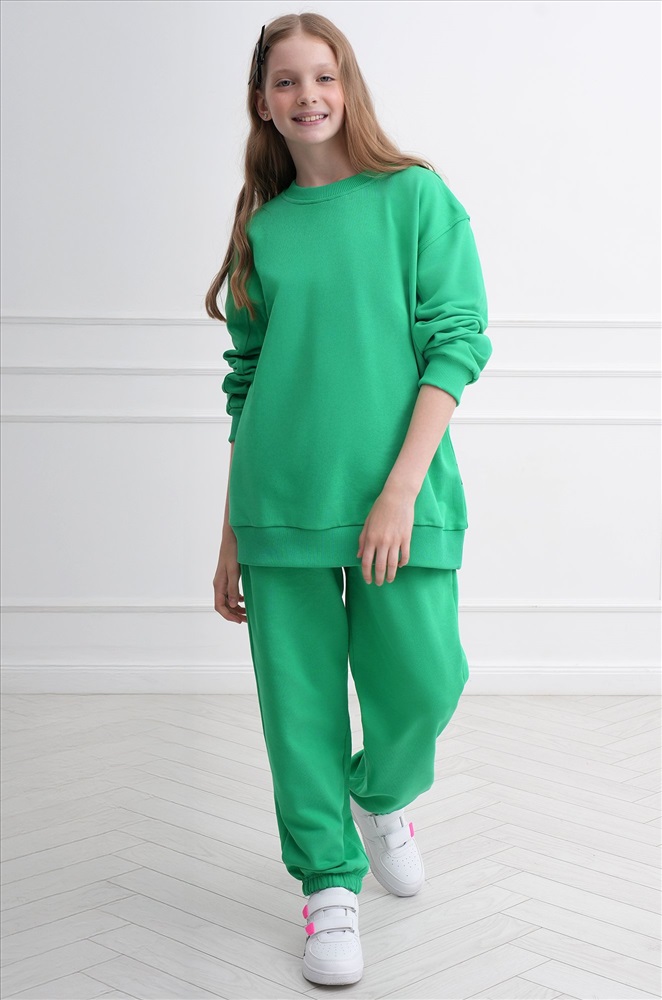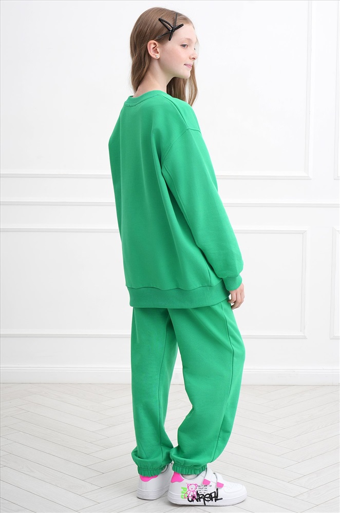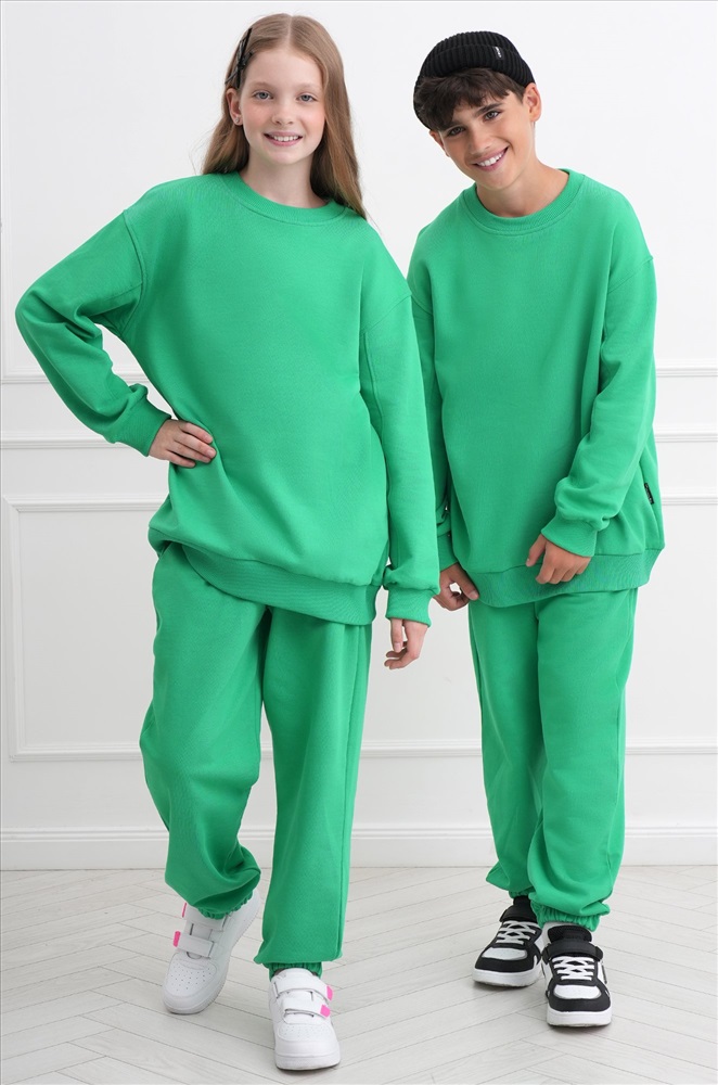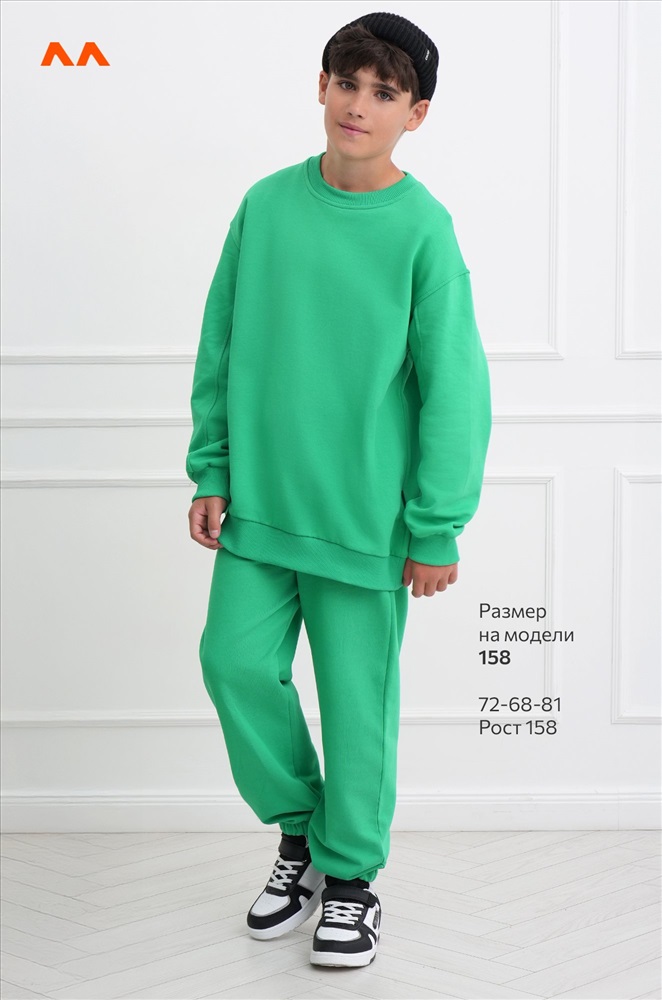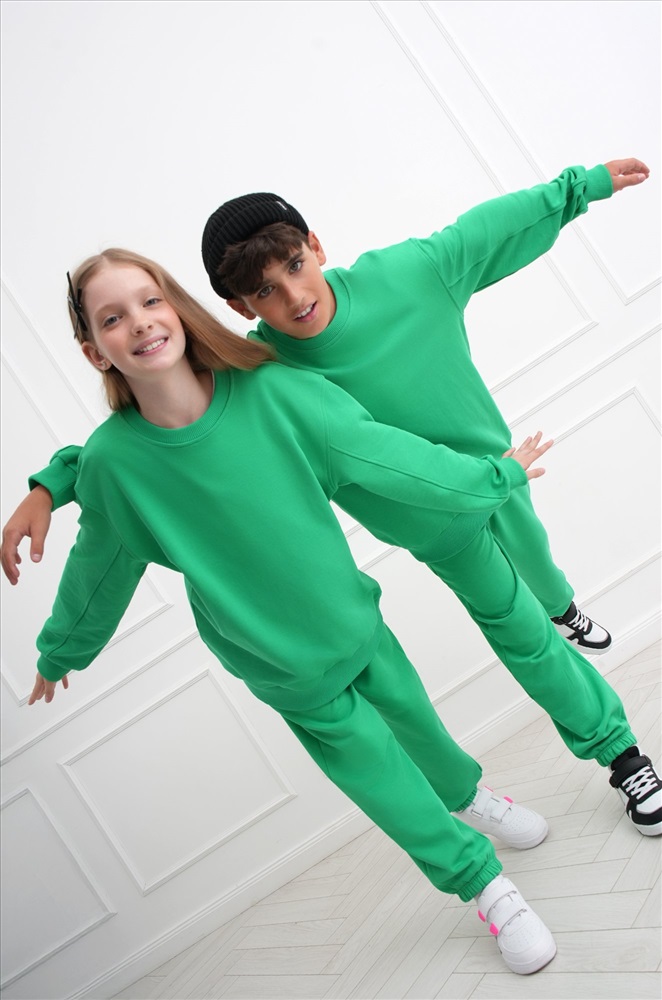 Демисезонный трикотажный костюм оверсайз для подростков пригодится на каждый день. Насыщенный зеленый цвет и свободный крой делают его идеальным выбором для мальчика и для девочки.