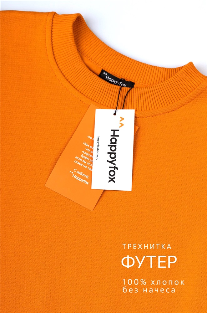 Бренд: Happyfox Страна: Узбекистан Состав: 100% хлопок Материал: Футер трёхнитка Плотность ткани: 310 г/м2 Цвет: оранжевый Акция: ЧЕРНАЯ ПЯТНИЦА