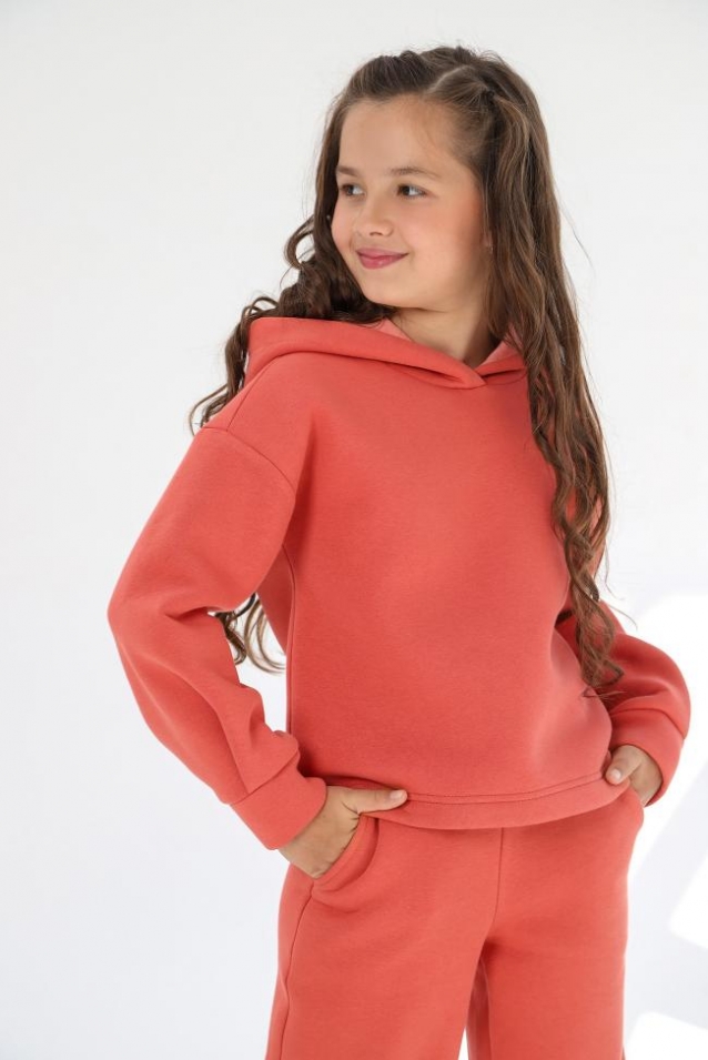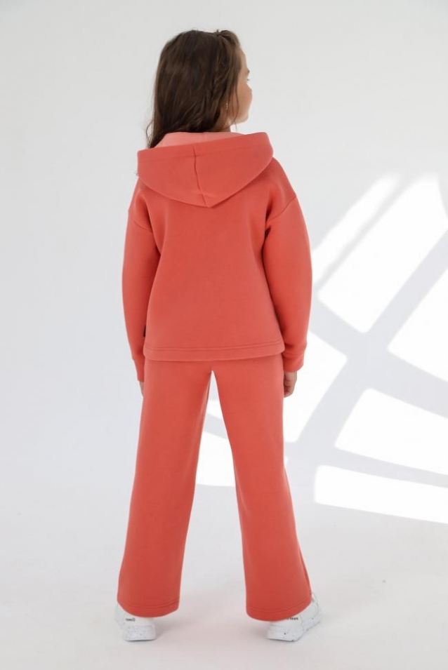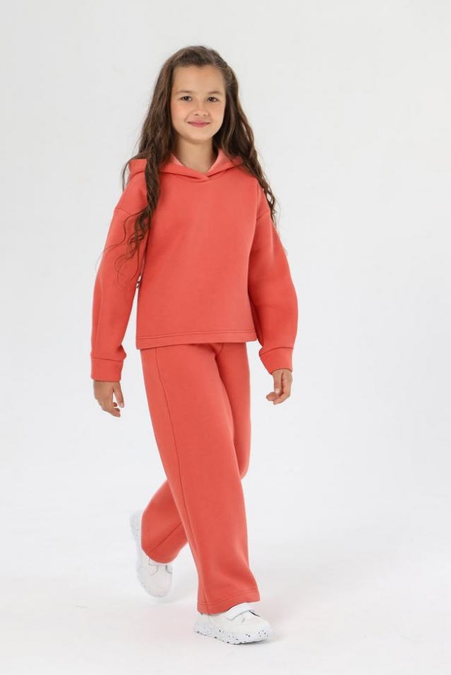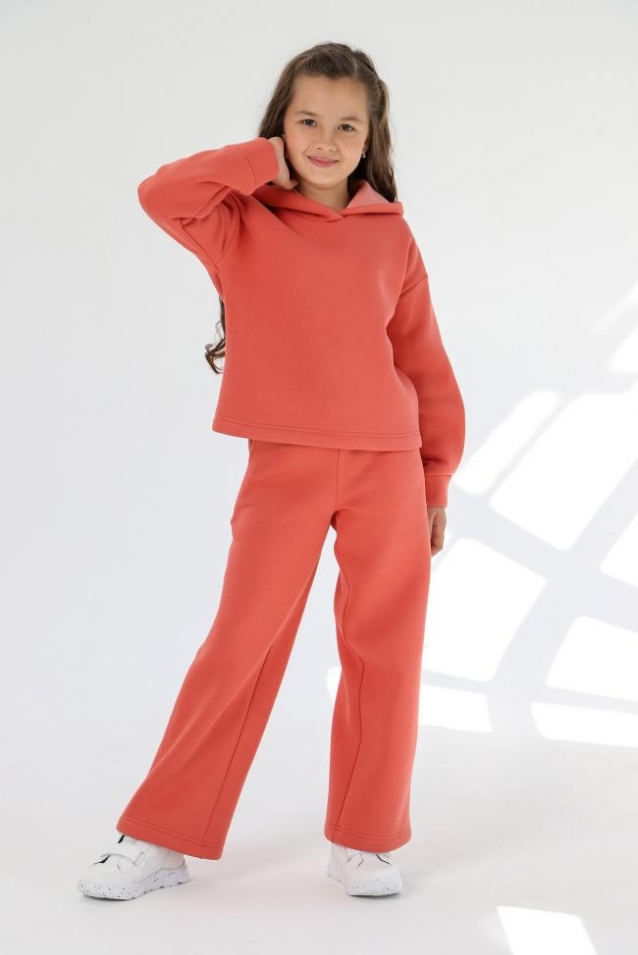 Костюм из футера с начесом для девочки. Джемпер со спущенной линией плеч, со складками и манжетами по низу рукавов, с капюшоном на подкладке. Брюки расширенные книзу, на притачном поясе с отстроченной эластичной тесьмой и внутренним шнуром, с карманами в боковых швах. Примерание: Дизайн вшивного декоративного элемента по низу бокового шва джемпера вариативен. Комментарии к товару