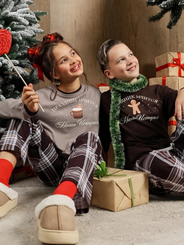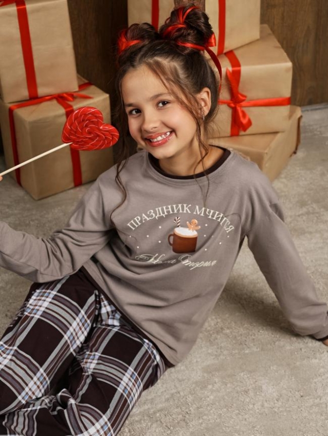 Костюм для девочки из трикотажного полотна "кулирка" в комбинации двух видов: гладкокрашенного и с рисунком в крупную клетку, сочетающихся между собой по цвету, состоящий из джемпера и брюк. Джемпер - из гладкокрашеного полотна, свободного покроя, с длинными втачными рукавами и приспущенными плечами, с горловиной овальной формы и тематическим принтом, выполненным в технике шелкографии. Горловина, нижние срезы рукавов и низ изделия обработаны подгибкой с отделочным широким кантом контрастного цвета. Брюки - из полотна в клетку, свободного покроя, прямые, на притачном поясе с эластичной тесьмой внутри, с карманами в боковых швах. Нижние срезы обработаны подгибкой.