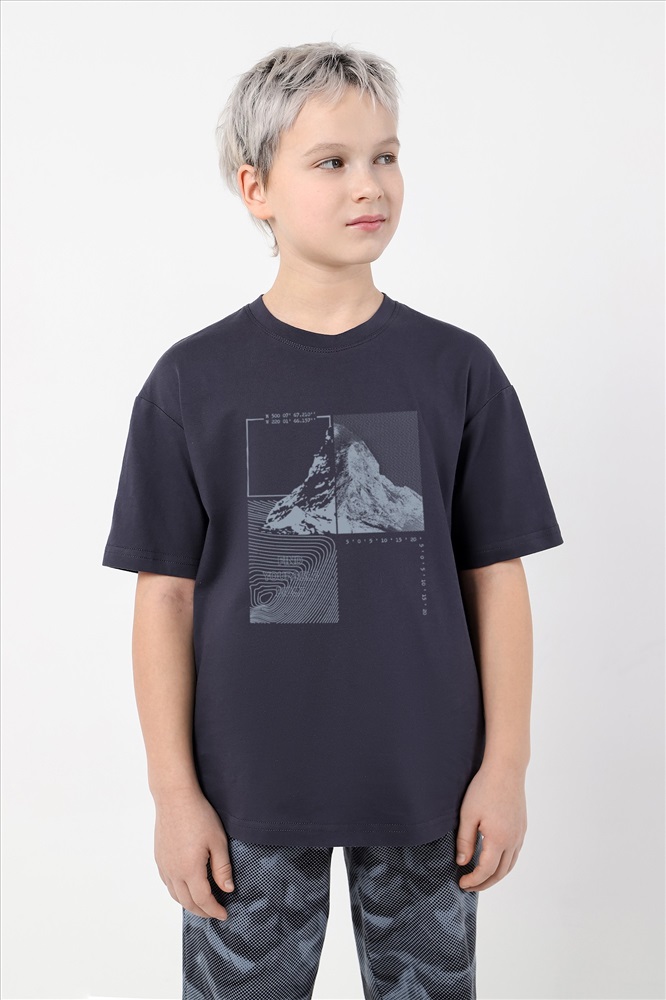 Состав: 100% хлопок Ткань: Кулирка Кулирка - это самое гладкое и тонкое трикотажное полотно из чистого хлопка. С лицевой стороны ткань «кулирка» выглядит как «вертикальные косички», орнамент изнаночной стороны напоминает «кирпичную кладку». Свойства кулирного трикотажа- воздухопроницаемость, гигроскопичность, не теряя своей формы, практически не тянется в длину и хорошо растягивается в ширину, не образует складки. Костюм для мальчика из трикотажного полотна "кулирка" в комбинации двух видов , состоящий из футболки и брюк. Футболка - из гладкокрашеного полотна, свободного покроя, со спущенным плечом, короткими втачными рукавами, горловиной овальной формы, обработанной втачной планкой, и принтом в центре переда. По шву втачивания планки настрочена двойная отделочная строчка. Брюки - из полотна с набивным рисунком, на притачном поясе с эластичной тесьмой внутри, с карманами в боковых швах. Входы в карманы окантованы основным материалом.