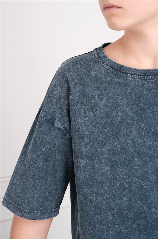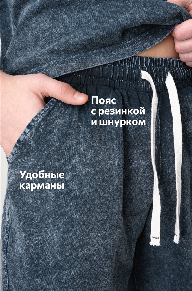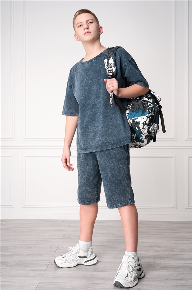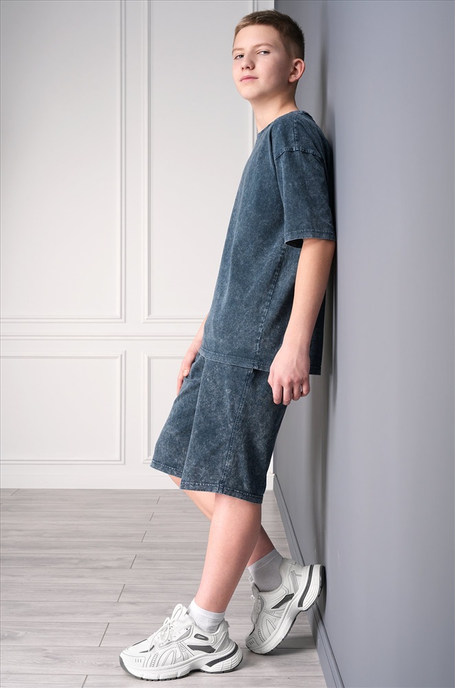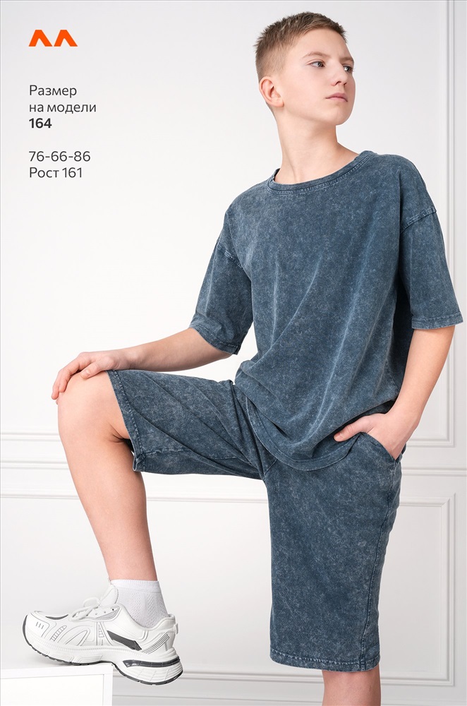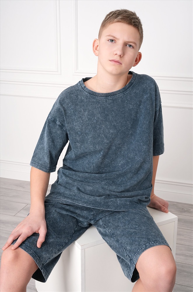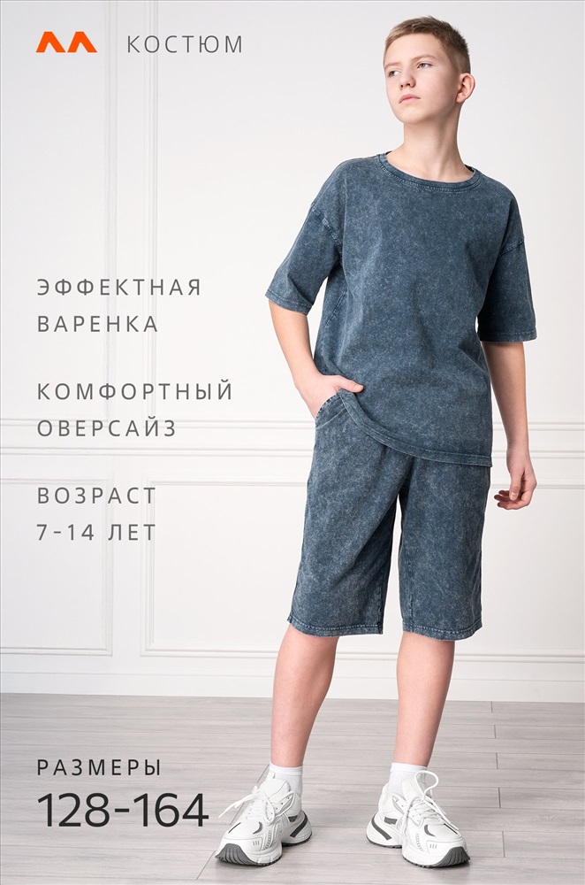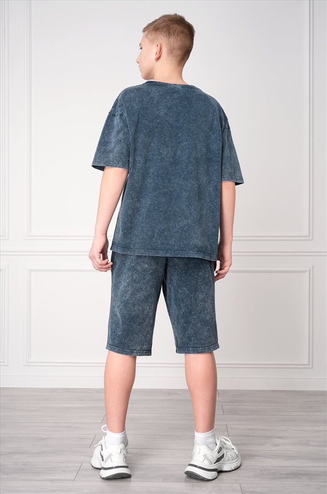 Летний костюм с шортами представлен в базовом оттенке индиго. Спортивный костюм для мальчика состоит из футболки оверсайз и удлинённых шорт. Вареный костюм для детей и подростков выполнен из 100% хлопка.