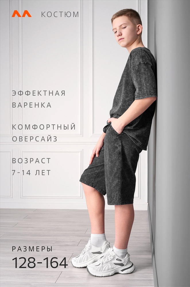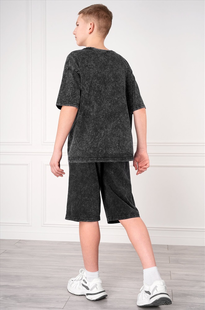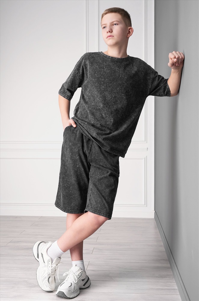 Летний костюм с шортами — универсальное решение на каждый день. Спортивный костюм для мальчика состоит из футболки оверсайз и удлинённых шорт. Вареный костюм для детей и подростков выполнен из 100% хлопка.