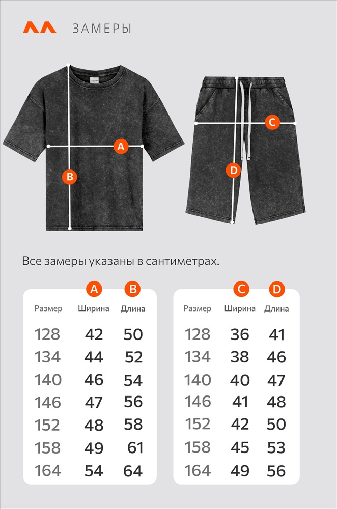 шорты: длина : 41 см; ширина по бедрам: 36 см. Размер 134: футболка: длина: 52 см; ширина: 44 см. шорты: длина : 46 см; ширина по бедрам: 38 см. Размер 140: футболка: длина: 54 см; ширина: 46 см. шорты: длина : 47 см; ширина по бедрам: 40 см. Размер 146: футболка: длина: 56 см; ширина: 47 см. шорты: длина : 48 см; ; ширина по бедрам: 41 см. Размер 152: футболка: длина: 58 см; ширина: 48 см. шорты: длина : 50 см; ширина по бедрам: 42 см. Размер 158: футболка: длина: 61 см; ширина: 49 см. шорты: длина : 53 см; ширина по бедрам: 45 см. Размер 164: футболка: длина: 64 см; ширина: 54 см. шорты: длина : 56 см; ширина по бедрам: 49 см. *замеры выборочные, могут незначительно отличаться. Комментарии к товару