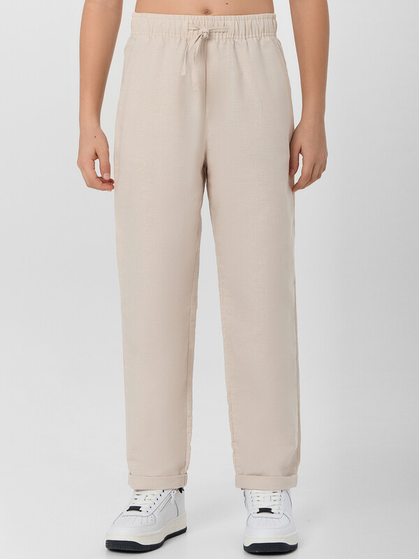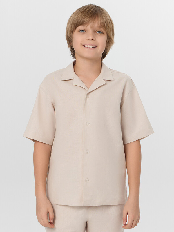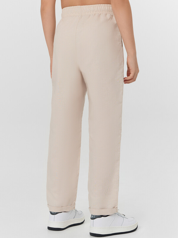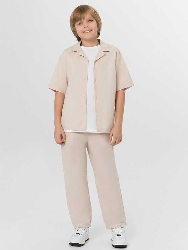 Комплект из двух предметов. Жакет прямого силуэта с воротником. По переду обработана застежка на пуговицы d=10mm и петли. Рукава короткие, втачные, слегка спущены. Нижние срезы изделия и рукавов обработаны швом в подгибку. Брюки прямого силуэта. Посадка средняя. Пояс цельнокроеный с эластичной тесьмой внутри. На поясе пробиты петли, заправлен шнур из основного полотна. По переду имитация гульфика, обработаны карманы с наклонным входом от боковых швов. Низ изделия с отворотами.