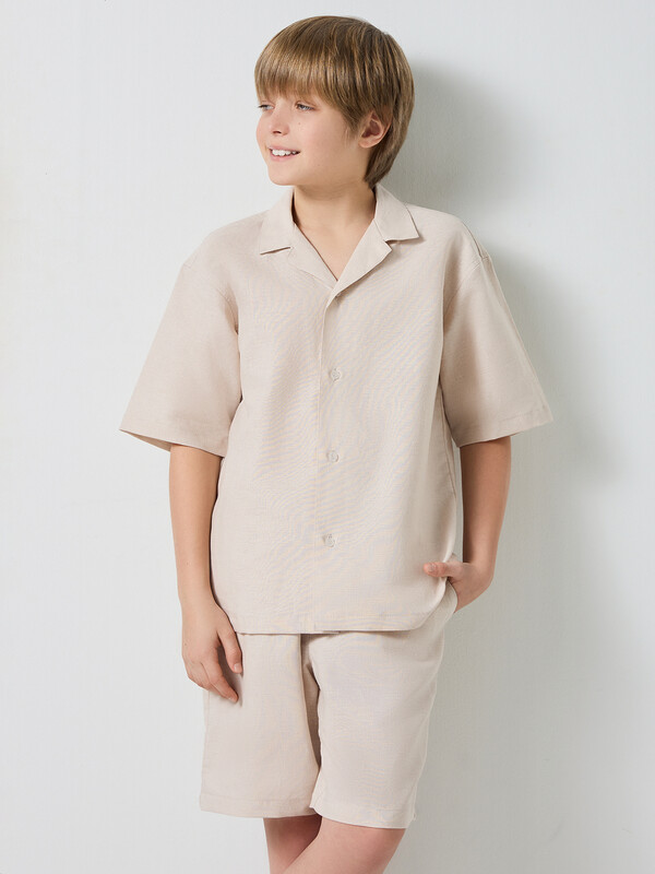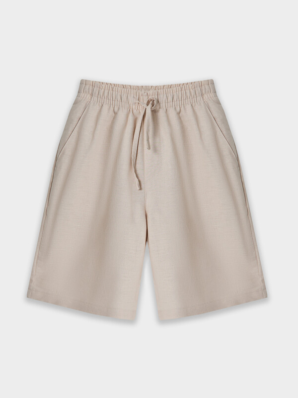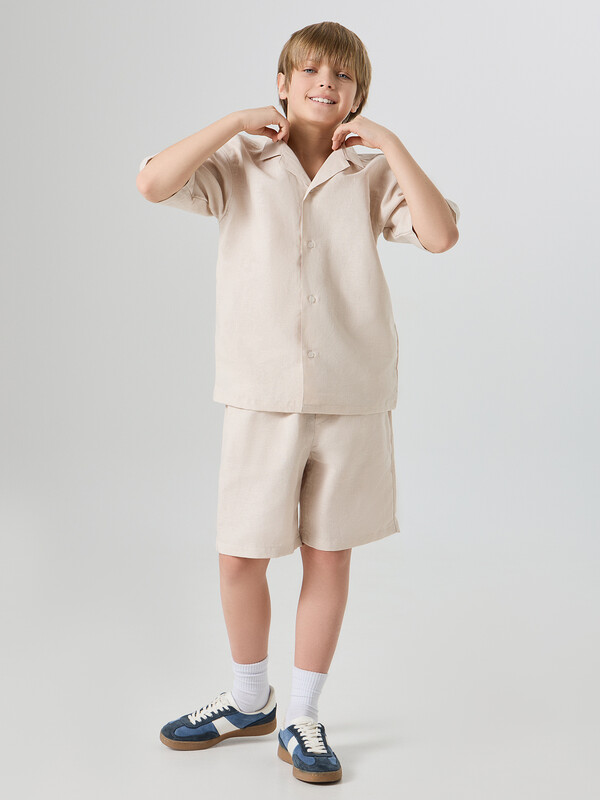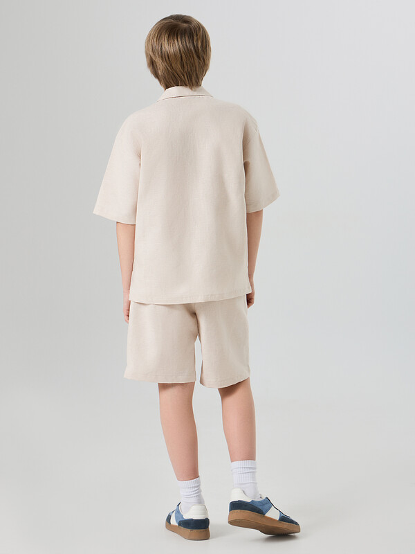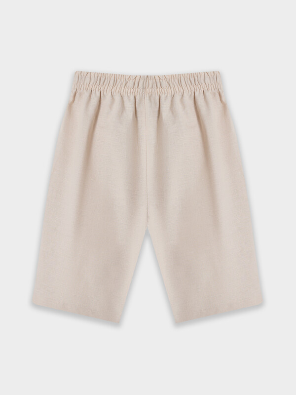 Комплект из двух предметов. Жакет прямого силуэта с воротником. По переду обработана застежка на пуговицы d=10mm и петли. Рукава короткие, втачные, слегка спущены. Нижние срезы изделия и рукавов обработаны швом в подгибку. Шорты прямого силуэта. Посадка средняя. Пояс цельнокроеный с эластичной тесьмой внутри. Шов сидения шорт распошит. На поясе пробиты петли, заправлен шнур из основного полотна. По переду имитация гульфика, обработаны карманы с наклонным входом от боковых швов. Низ шорт обработан швом в подгибку.