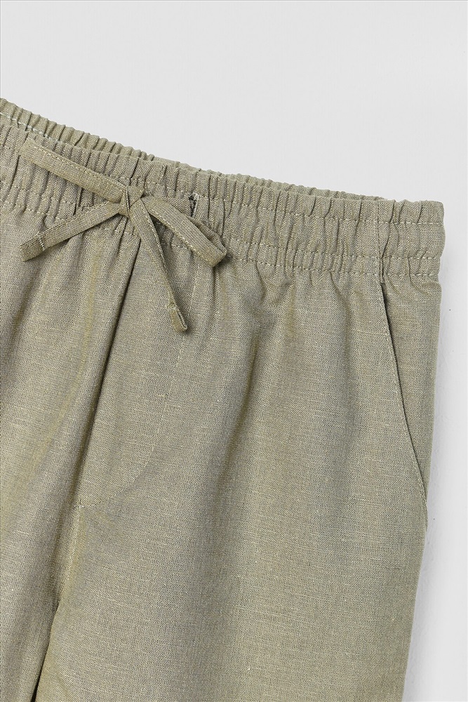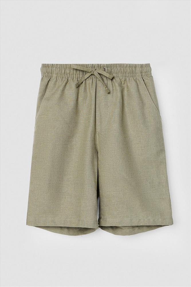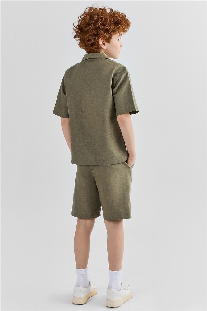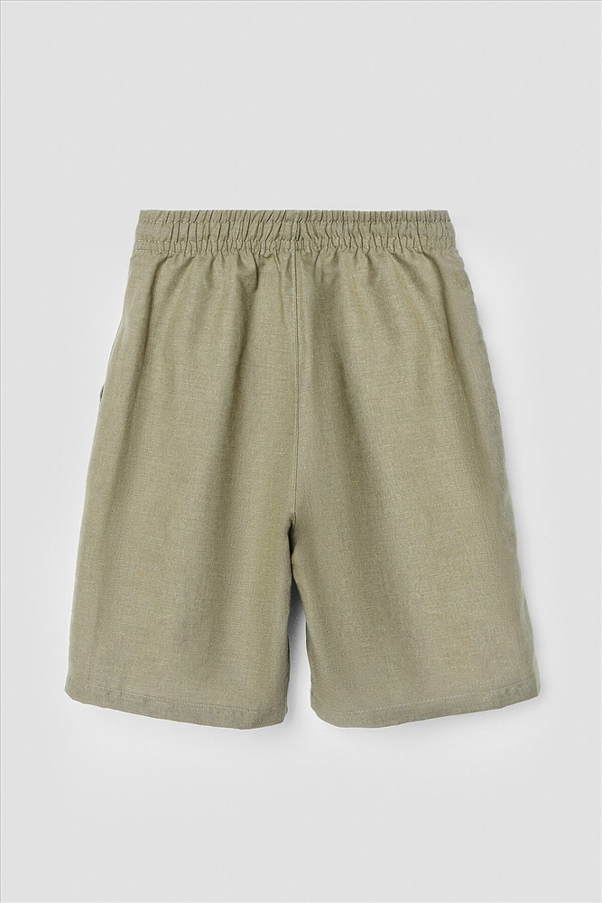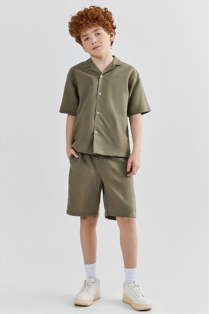 Комплект из двух предметов. Жакет прямого силуэта с воротником. По переду обработана застежка на пуговицы d=10mm и петли. Рукава короткие, втачные, слегка спущены. Нижние срезы изделия и рукавов обработаны швом в подгибку. Шорты прямого силуэта. Посадка средняя. Пояс цельнокроеный с эластичной тесьмой внутри. Шов сидения шорт распошит. На поясе пробиты петли, заправлен шнур из основного полотна. По переду имитация гульфика, обработаны карманы с наклонным входом от боковых швов. Низ шорт обработан швом в подгибку.
