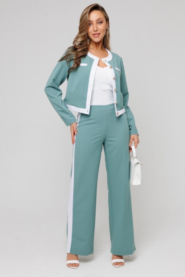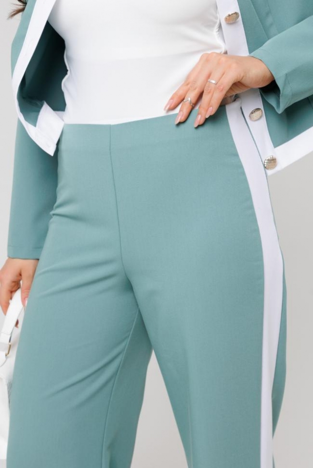 Костюм офисный вечерний от российского производителя бренда женской одежды. Жакет костюма застегивается на пуговицы, имеет имитацию карманов. По низу, переду и горловине жакета имеется контрастная планка, которая придает элегантности образу. Брюки свободного кроя по бокам имеют лампасы контрастного цвета, застегиваются на потайную молнию с левой стороны, сзади пресутсвуют имитация прорезных карманов. Этот стильный женский комплект идеально подходит для различных мероприятий, где требуется продемонстрировать уверенность и элегантность. Модель включает пиджак и брюки, что создает гармоничный образ. Базовый вариант подойдет для повседневного ношения в офис, на вечер или на деловое мероприятие. На любом празднике Вы будете чувствовать себя нарядно и комфортно. Благодаря гладкой фактуре материала и отсутствию ярких рисунков, двойка легко сочетается с любыми аксессуарами и обувью, делая его универсальным выбором для вечерних нарядов. Универсальность модели позволит носить его, в теплые весенний и летний сезоны. Женский брючный наряд выполнен из качественных материалов, обеспечивая комфорт на протяжении всего дня. Его классический дизайн легко комбинируется с различными аксессуарами, что позволяет создавать уникальные образы в зависимости от настроения и случая. Однотонная текстура делает его универсальным выбором для любого гардероба. Идеально подойдет для женщин невысокого роста, а также для высоких девушек. Каждый элемент костюма может носиться отдельно в сочетании с другими элементами гардероба, создавая стильные и модные образы. Трендовый костюм позволит подчеркнуть стройность Вашей фигуры. Модель доступна в больших размерах плюс сайз - 50, 52 и 54, будет шикарно смотреться в любом возрасте, подойдет для полных девушек и беременных женщин.