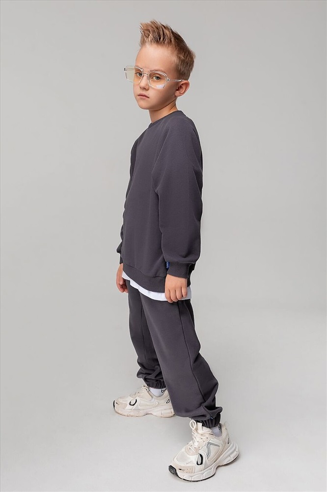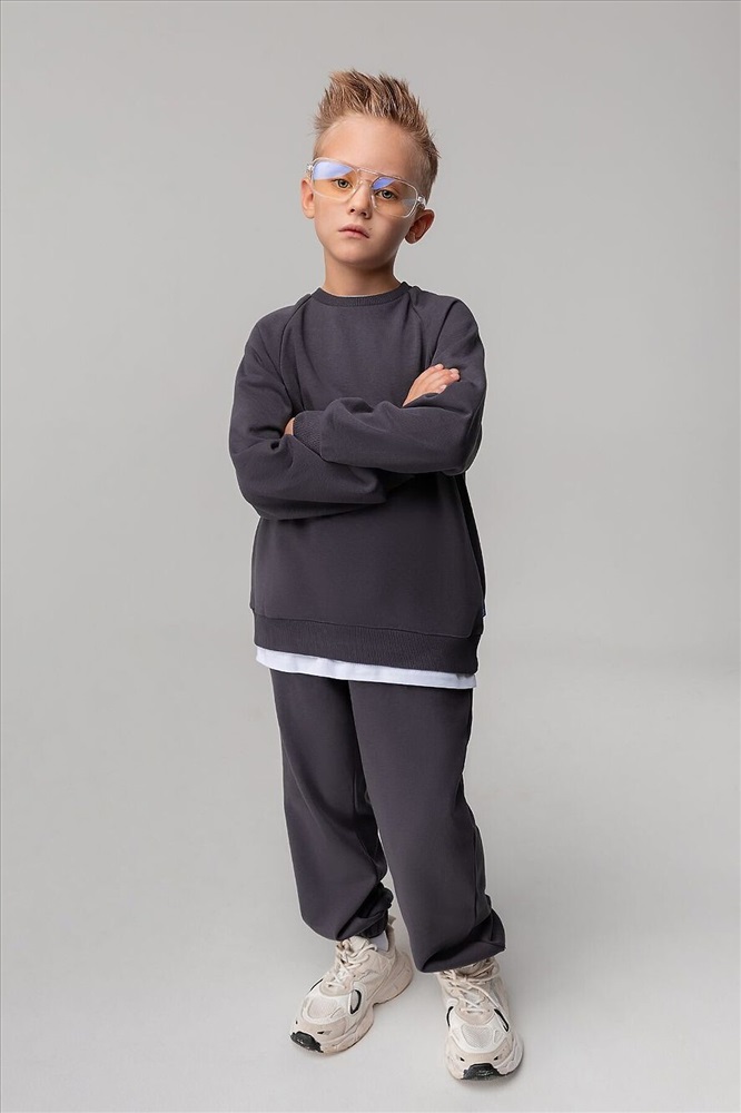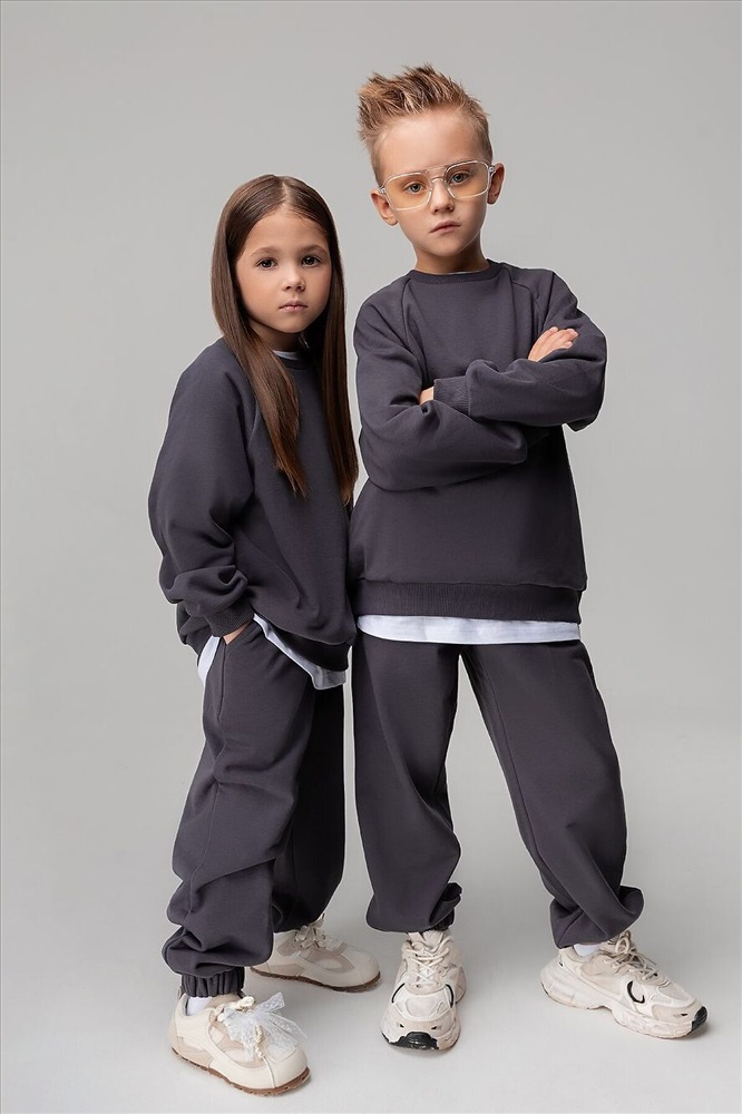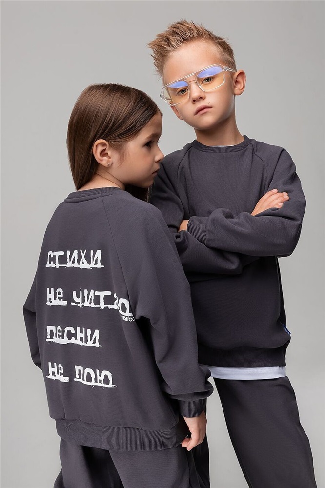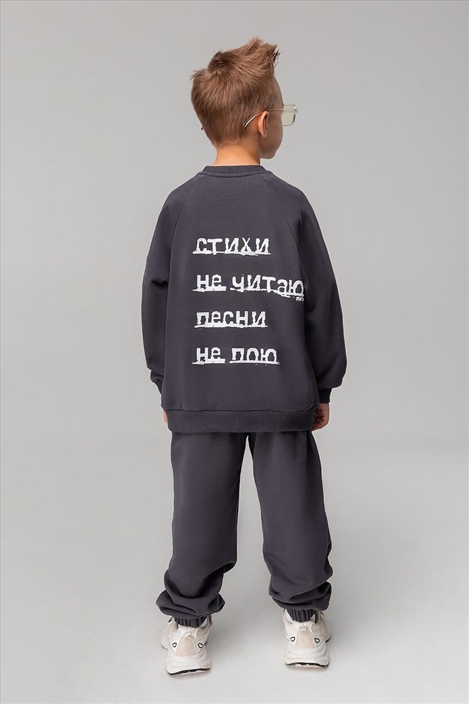 Костюм: свитшот и брюки. Свитшот прямого силуэта, с длинным рукавом на манжете. Свитшот с поясом по низу изделия. На спинке принт "Стихи не читаю Песни не пою" . Свободные брюки на поясе с внутренней резинкой. Низ брюк с манжетой на резинке. Брюки с боковыми карманами.